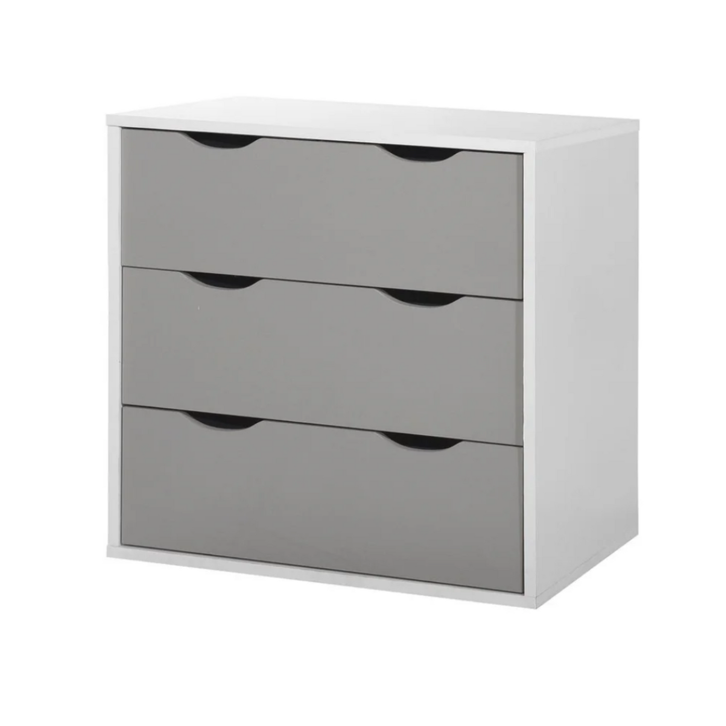 Alton 3 Drawer Chest of drawers in a modern design with a cut out handle in white and grey.