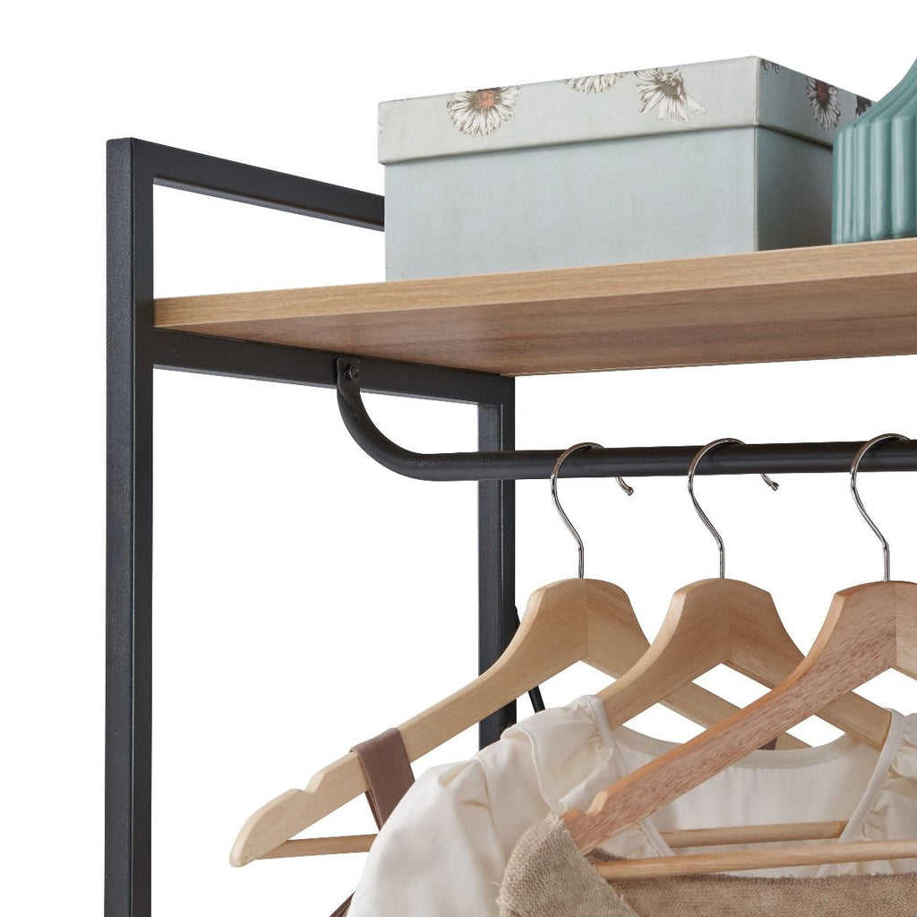 This Claire Open Wardrobe offers open storage and features a Light Oak Finish with Metallic Frames. This item includes a rail for hanging your shirts, suits, or dresses with an additional 3 shelves for extra storage.