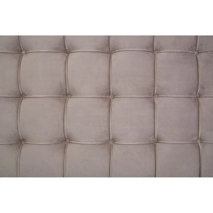 The bed's sturdy stainless steel frame boasts a sleek silver finish and a minimalist design, while the headboard is adorned with soft grey velvet and square tufting for a subtly textured appearance. Plush velvet lines the sides, adding to the opulent aesthetic.
