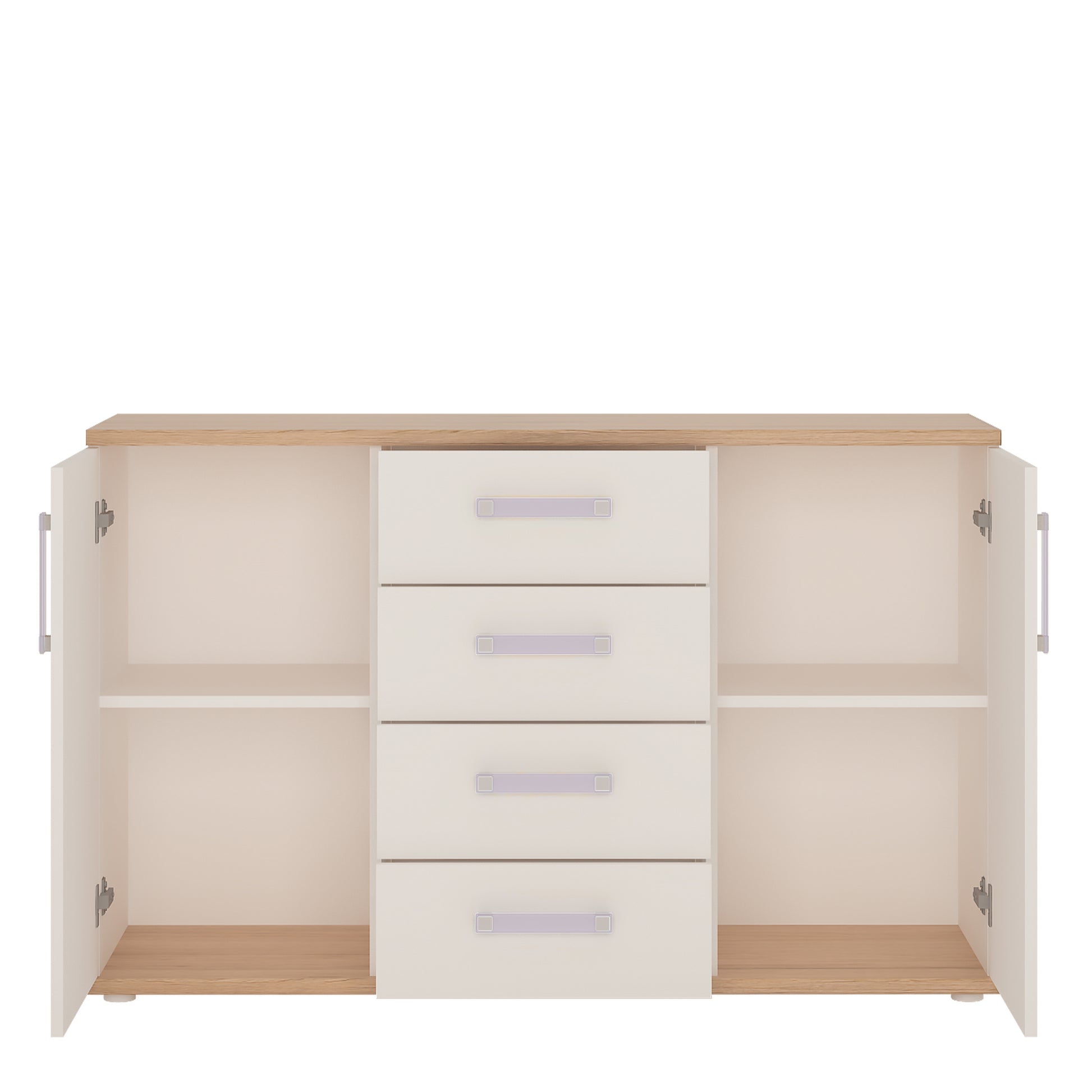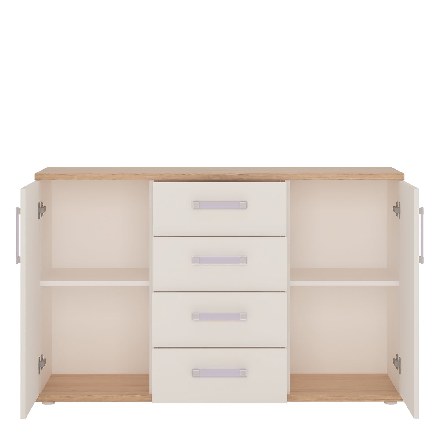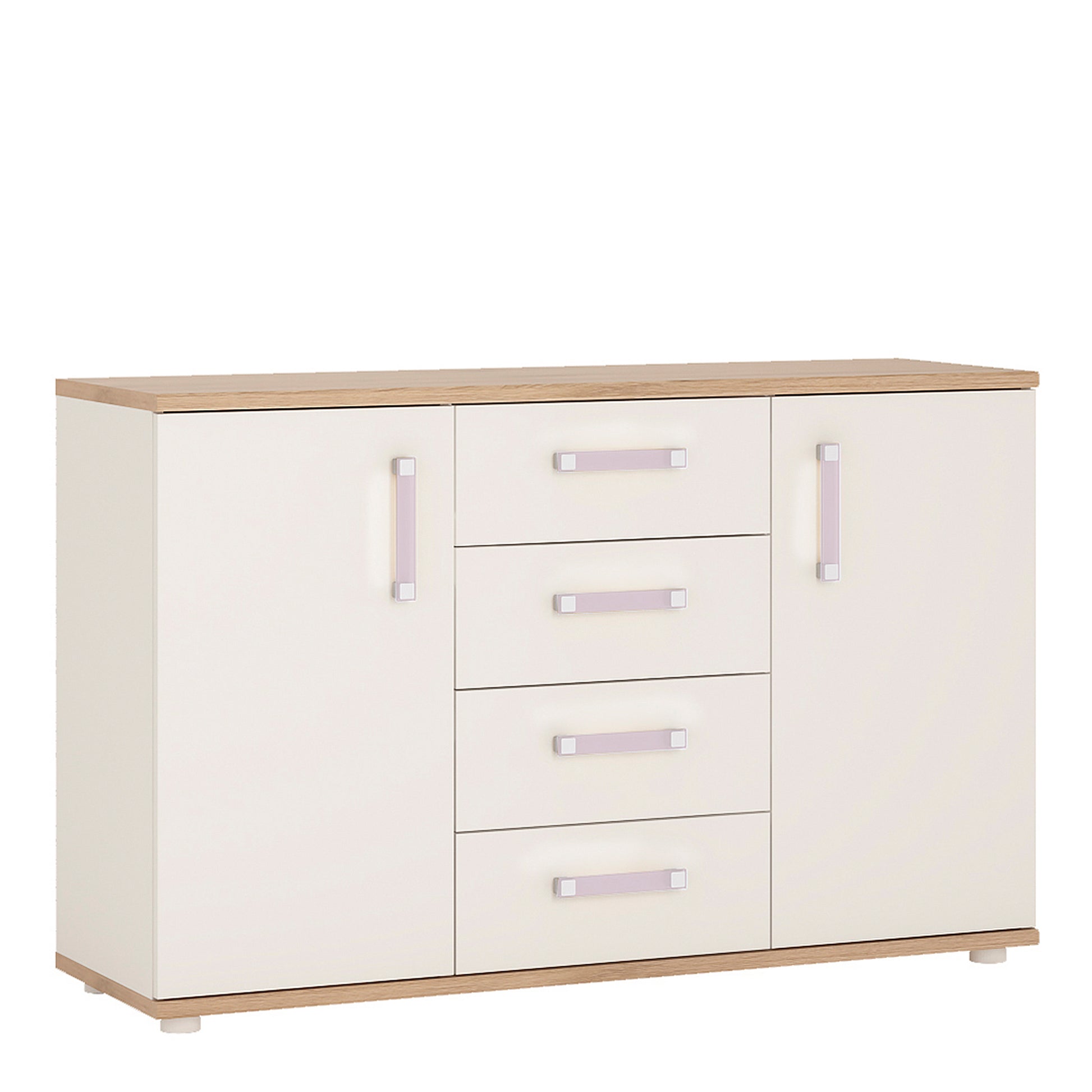 2 door 4 drawer sideboard in light oak and white high gloss with lilac handles. This neutral and functional kids collection is perfect for all age groups, finished in light oak and stunning white high gloss. Masses of storage in this wide 4 drawer 2 door sideboard, with internal adjustable shelves.