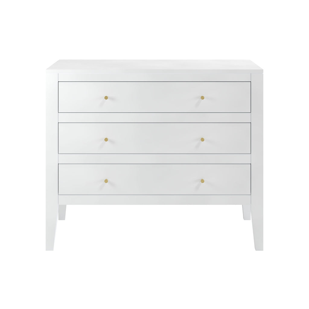 Indulge in the sophisticated elegance of the luxurious Nell Chest of Drawers in opulent white. Expertly crafted from birch wood and mdf, this piece features tapered legs, clean cut lines, and smooth wooden runners for the three spacious drawers. Finished with glamorous brass handles, it exudes a sense of exclusivity and refinement.