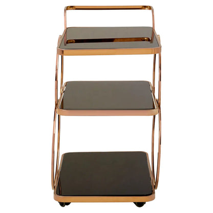 Crafted from luxurious rose gold stainless steel, the Alvaro drinks trolley boasts intricate circle designs on its frame and handle. Three levels of tempered black glass provide a striking contrast to the opulent metallic construction. With four wheels for effortless mobility, this trolley exudes elegance and sophistication.