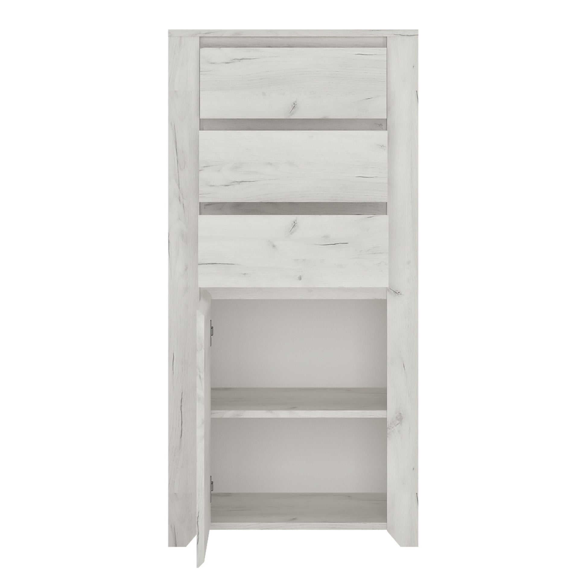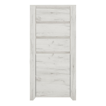 1 Door 3 Drawer Chest. This beautifull bedroom collection is contemporay and stylish and suitable for all age groups, finished in a modern hard wearing white crafted Oak melamine. A space saving storage solution, narrow 3 drawers over cupboard with interiors shelf.