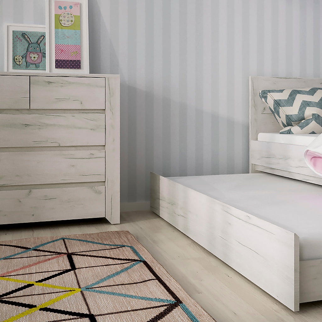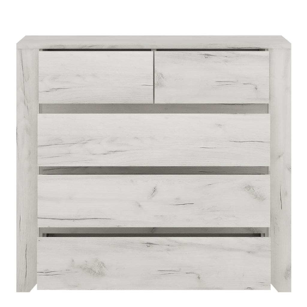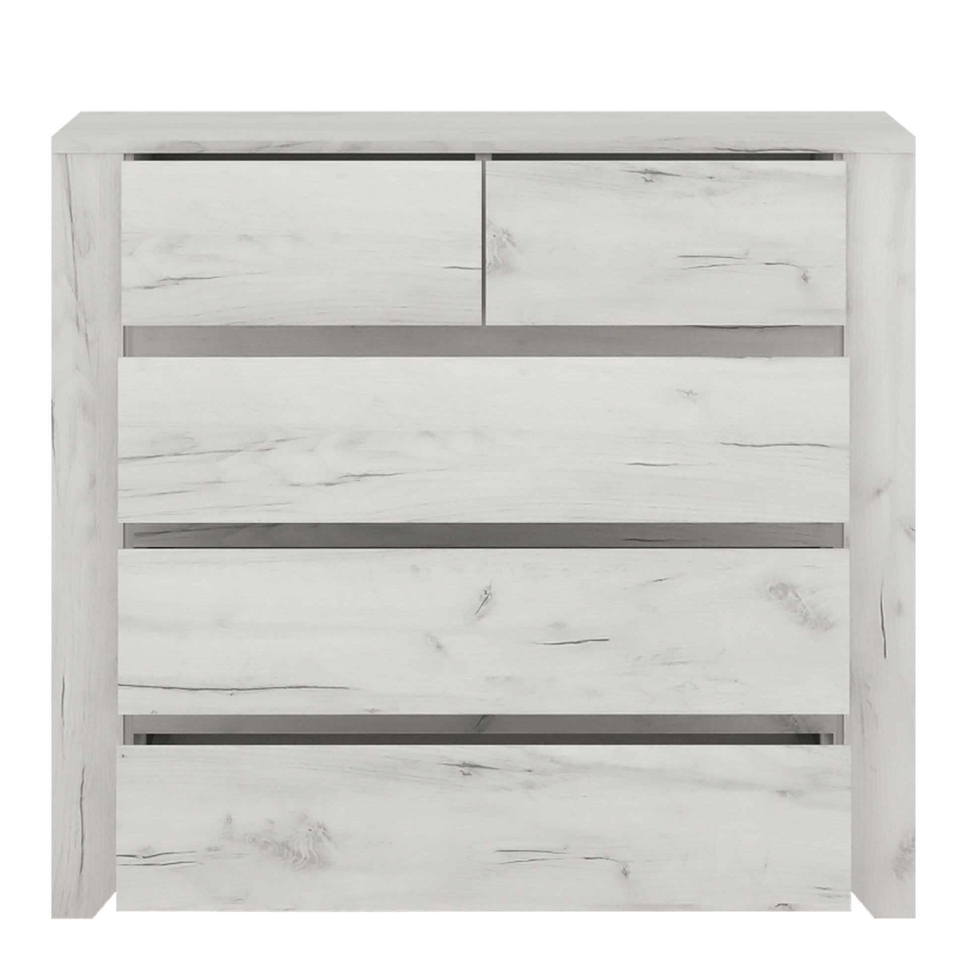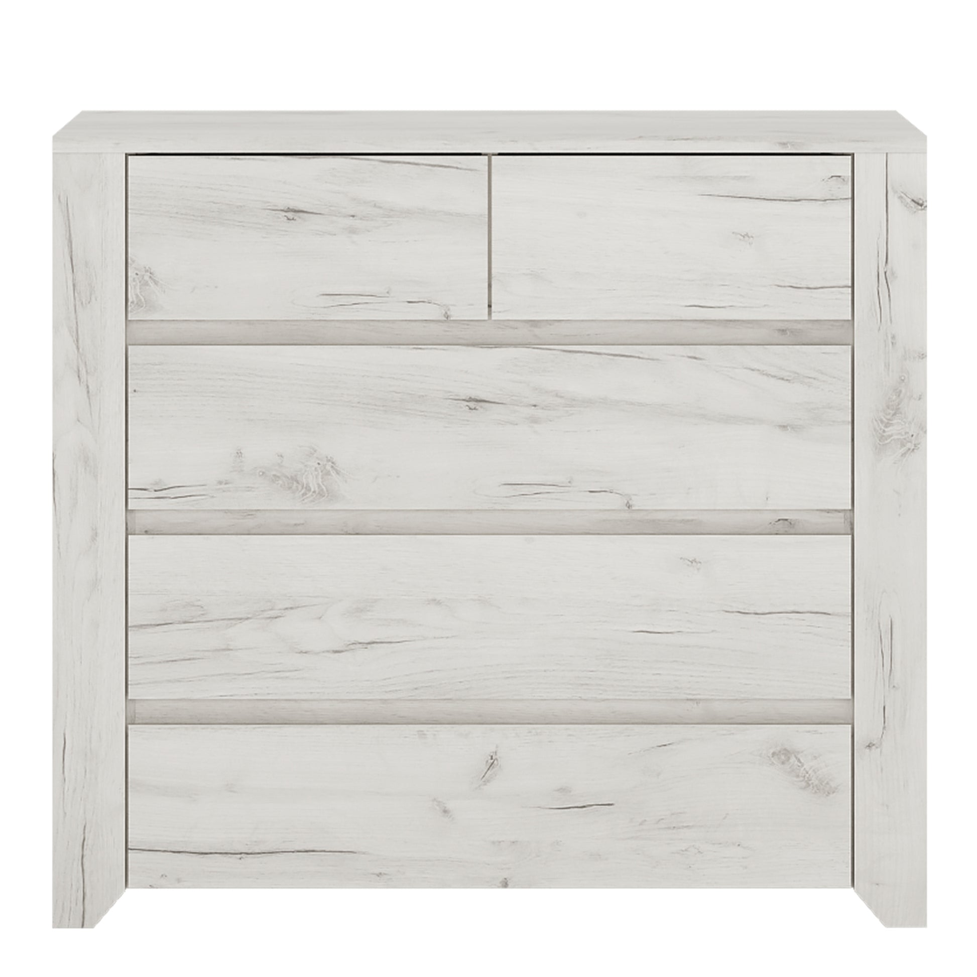 2+3 Chest of Drawers. This beautifull bedroom collection is contemporay and stylish and suitable for all age groups, finished in a modern hard wearing white crafted Oak melamine. A handy compact 2 small over 3 wide drawer chest. 77cm wide top is handy display area for family photo's etc.