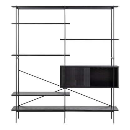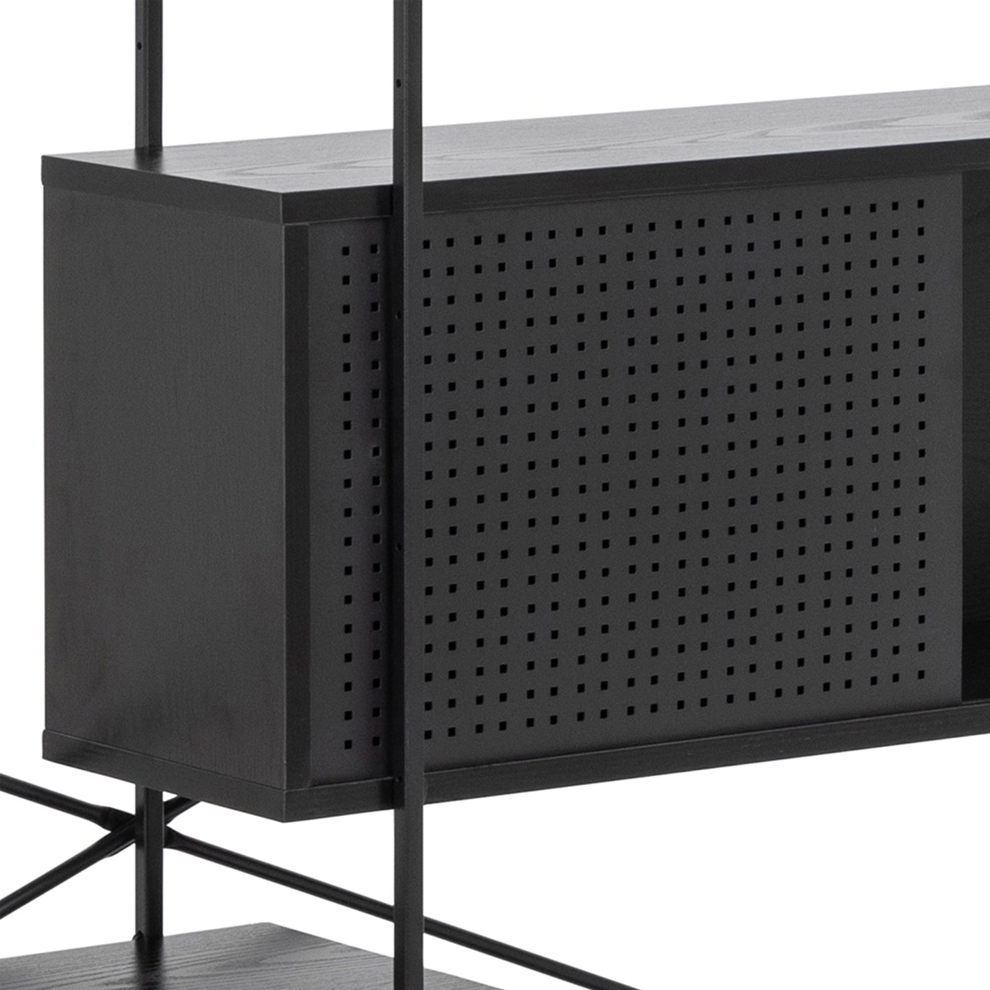 Introducing a contemporary and asymmetrical wall unit designed to showcase your items with flair. Its mix of wires and shelves arranged at varying levels ensures every displayed object receives attention. For added contrast and discreet storage, it includes a cabinet with sliding doors, harmonizing the overall design.