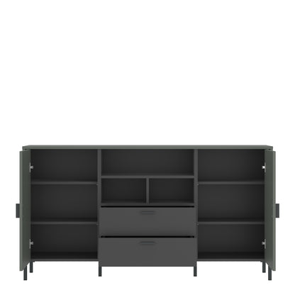 Enhance your home with the Arundel Grey Green 2 Door 2 Drawer Sideboard. Featuring a chic grey-green shade and crafted from durable chipboard, it offers both style and function. Spacious drawers with full-extension ball-bearing guides and soft-close doors ensure smooth operation. High metal legs add a modern touch, complementing various interior styles from boho to vintage. Perfect for living or dining rooms, it blends practical storage with timeless design.