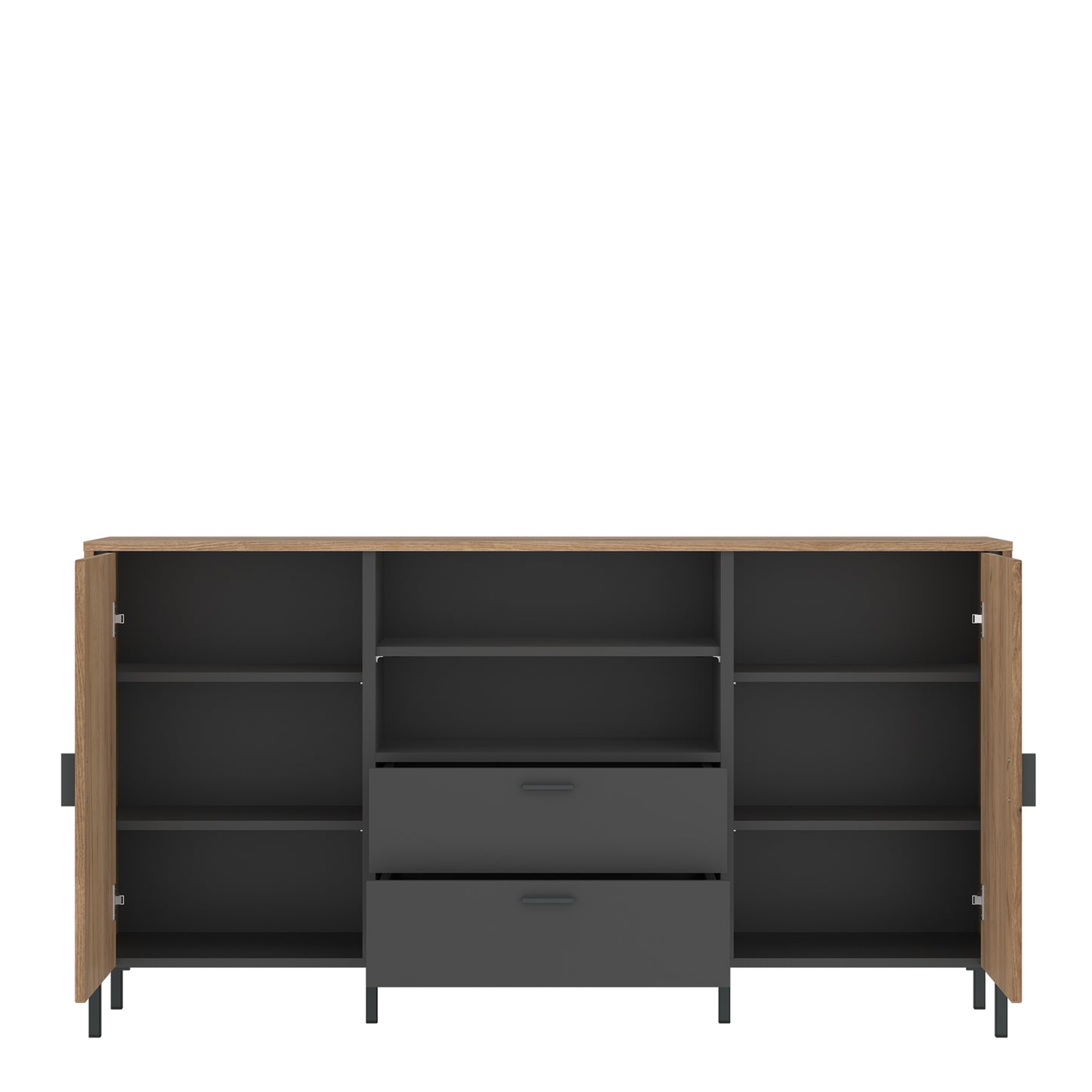 Elevate your living or dining room with the Arundel Oak Sideboard. Its chic oak shade and anthracite accents blend elegance with practicality. Crafted from laminated chipboard and MDF, it features two doors, two drawers with ball-bearing guides, and a top flap for extra storage. Soft-close hinges and high metal legs enhance its modern, refined look.