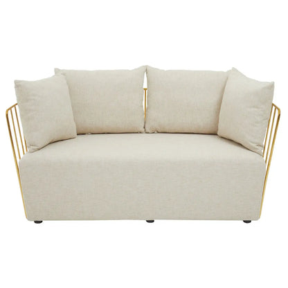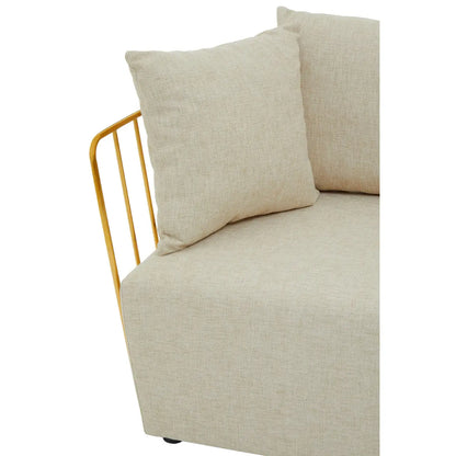 Indulge in the opulent allure of our Azalea Two Seat Natural Fabric Sofa. The sophisticated combination of natural fabric and gold effect metal frame exudes a sense of grandeur and elegance. A sleek series of stainless steel bars forms a striking angular profile. Sink into the comfortable foam-padded seat, complete with four luxurious pillows for a truly cozy seating experience.