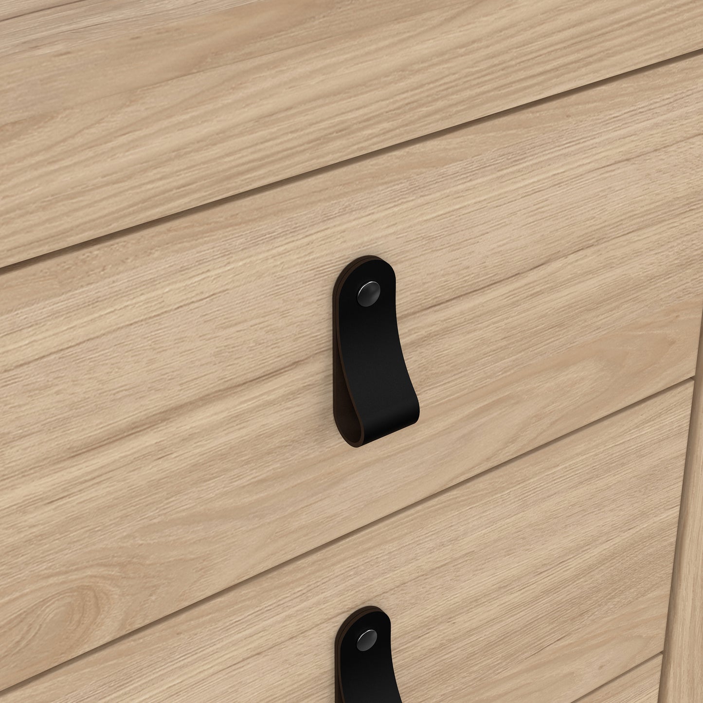 Enhance your bedroom with the elegant Barcelona Bedside Table. Made with a Jackson hickory oak effect, it features three drawers drawer with leather strap handles and smooth gliding runners. This stylish and functional piece is perfect for any modern bedroom.