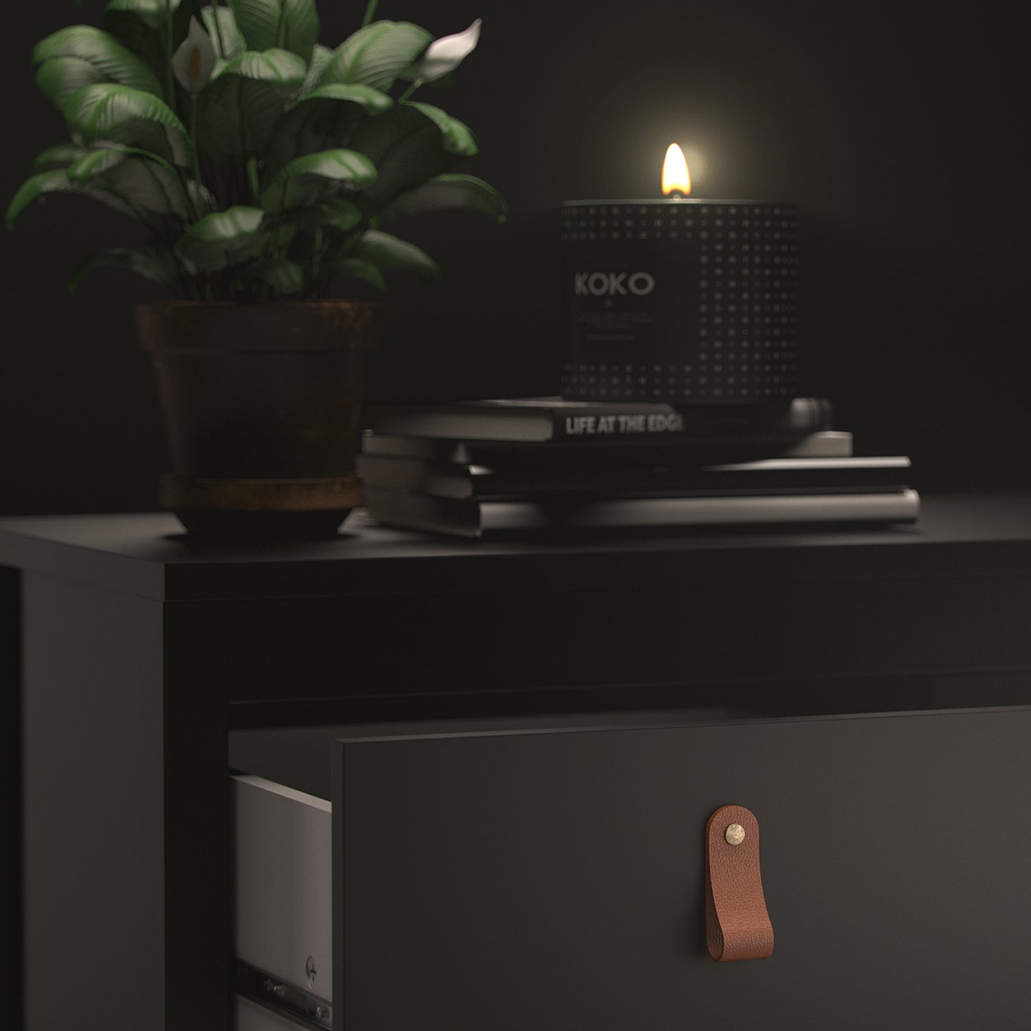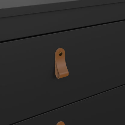 A modern chest of drawers in a striking design complete with brown leather tab handles, also available in white
