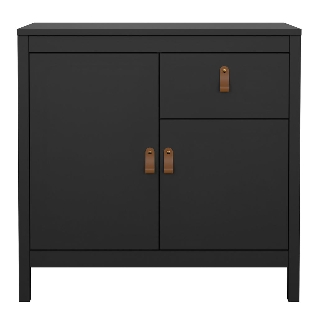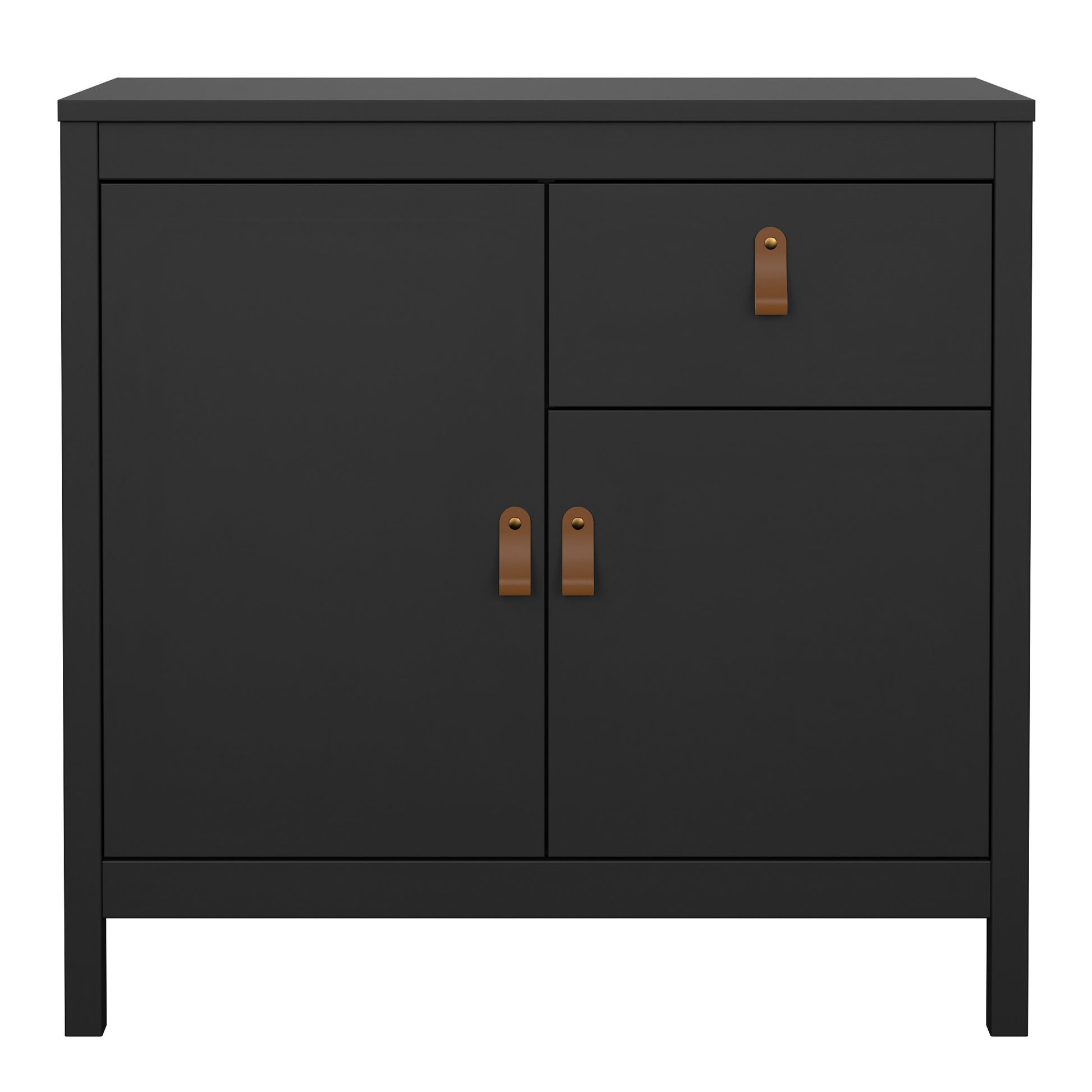 A modern sideboard inclduing plenty of storage in a striking design complete with brown leather tab handles, also available in white