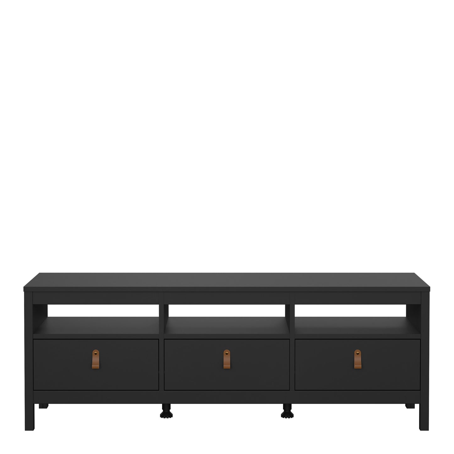 A modern tv-unit including 3 drawers for all your storage needs in a striking design complete with brown leather tab handles, also available in white