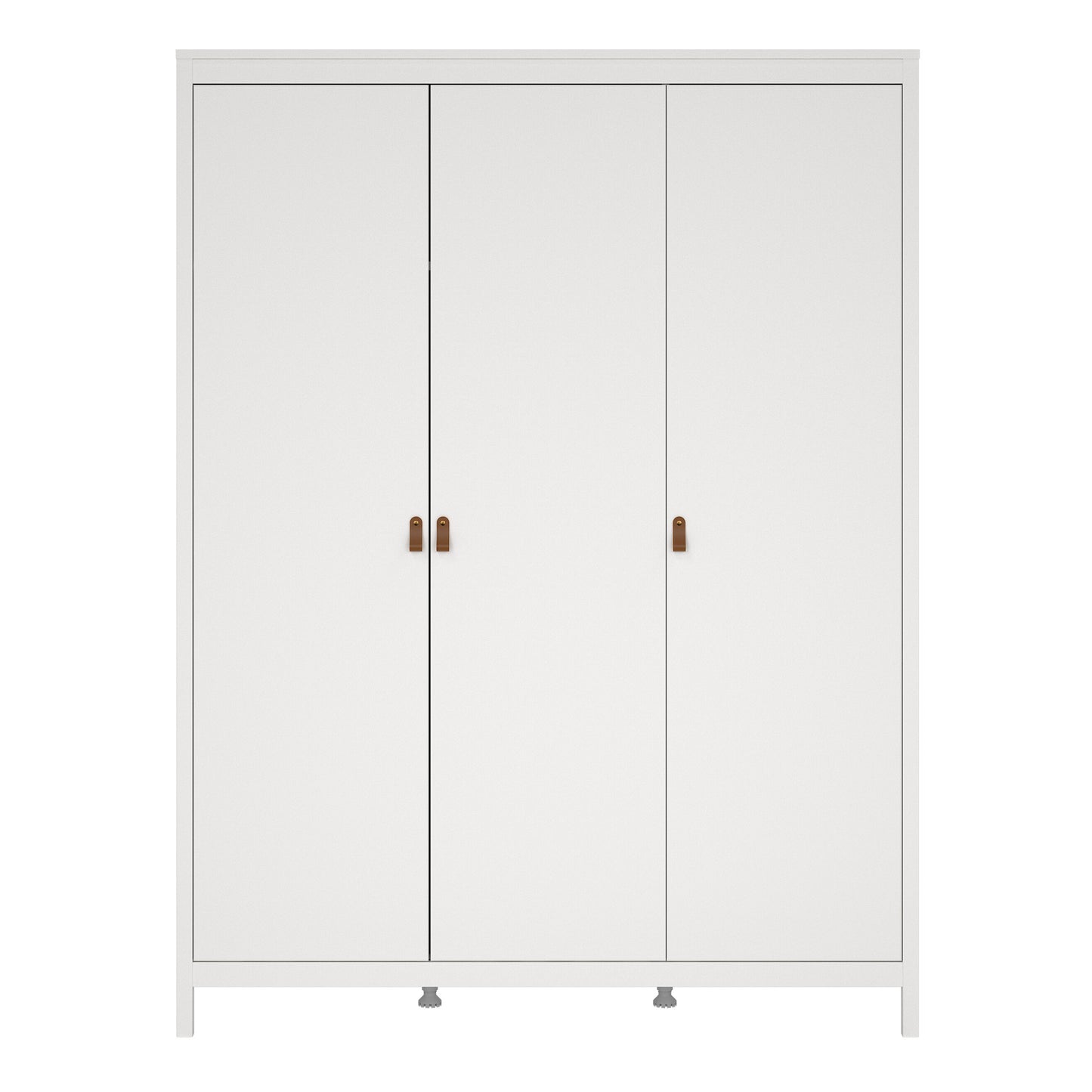 A modern large wardrobe with three doors in a striking design complete with brown leather tab handles, also available in contrasting matt black