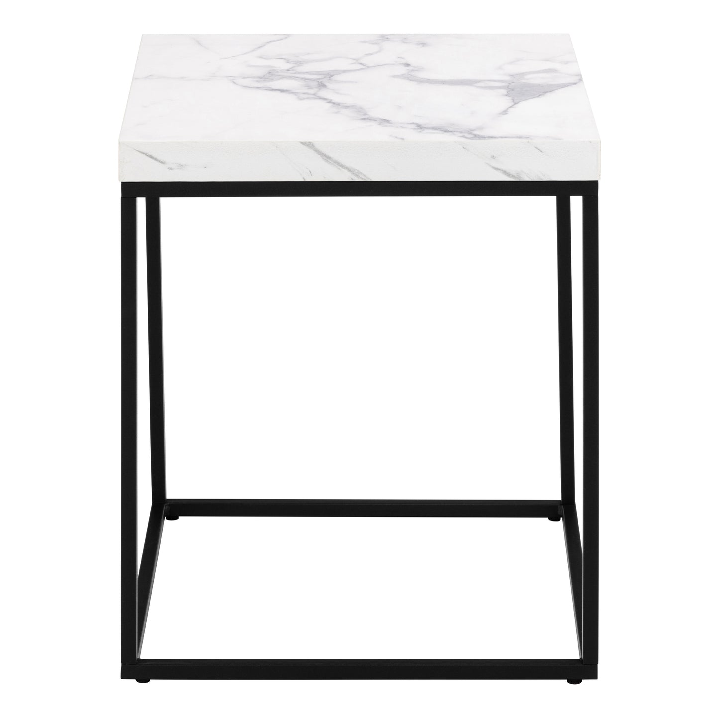 Accentuate your living space with a square coffee table that pairs the classic beauty of a white marble effect with the modernity of a matte black steel base, offering a chic and elegant focal point.