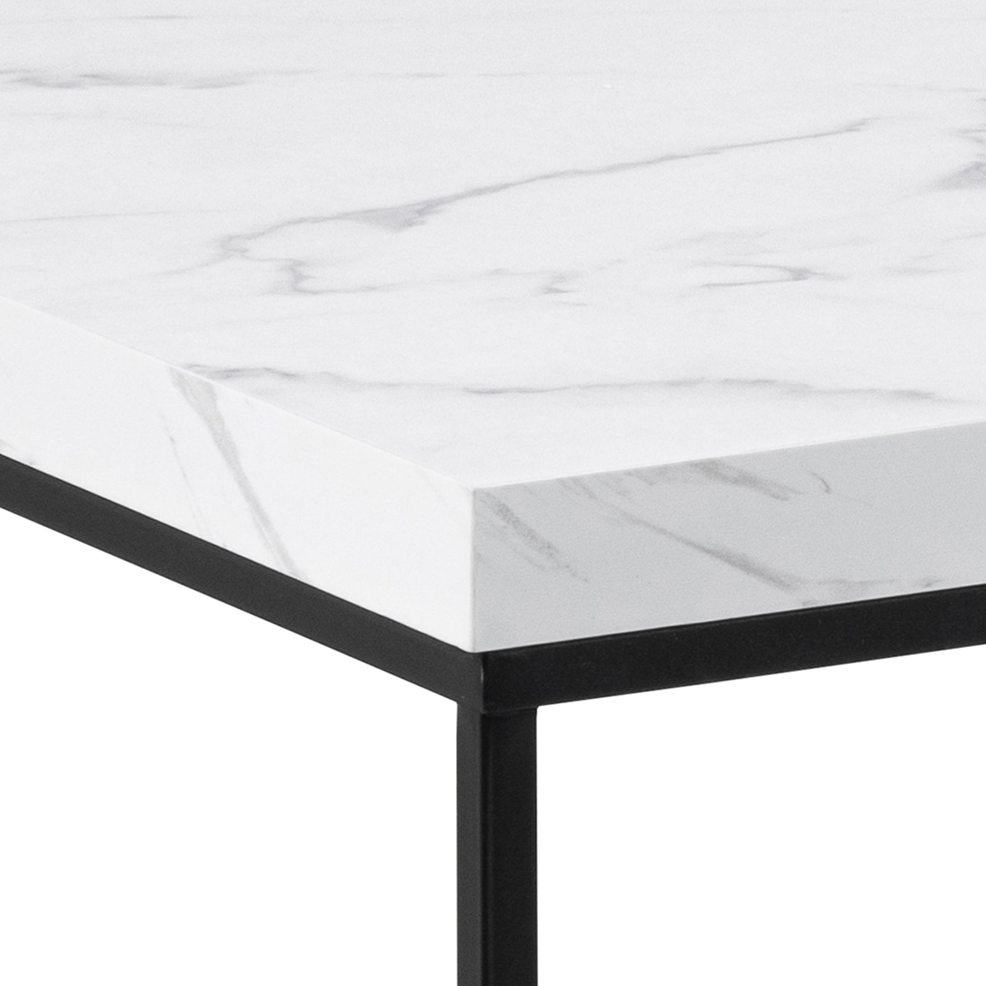 Introduce a pristine elegance to your decor with a rectangular coffee table, showcasing a white marble effect top, perfectly complemented by a matte black steel base for a timeless, modern aesthetic.