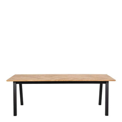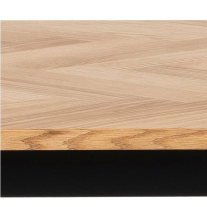 Invite sophistication into your dining space with this beautifully crafted rectangular table. It features an oak oiled veneer top adorned with a herringbone pattern, paired with a sleek black base. Designed with the foresight for extension leaves, it's perfect for both intimate dinners and larger gatherings