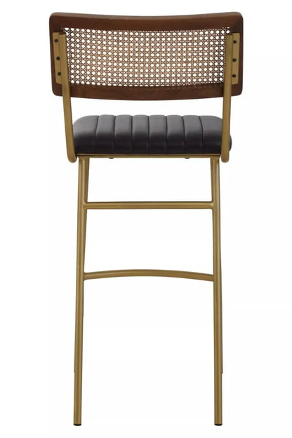 This luxurious bar chair exudes a sophisticated aesthetic, blending contemporary design elements seamlessly. The plush cushioned seat is wrapped in authentic black leather, adorned with refined channel tufting, creating a striking juxtaposition against the opulent gold-finished iron frame.