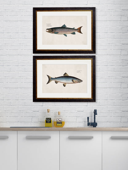Bringing back to life a delightful pair of late-18th century French illustrations of salmon, this set of prints make a handsome addition to a tastefully furnished room. We’ve painstakingly restored them here in our Lancashire studio to return their vivid colour and detail to their former glory.