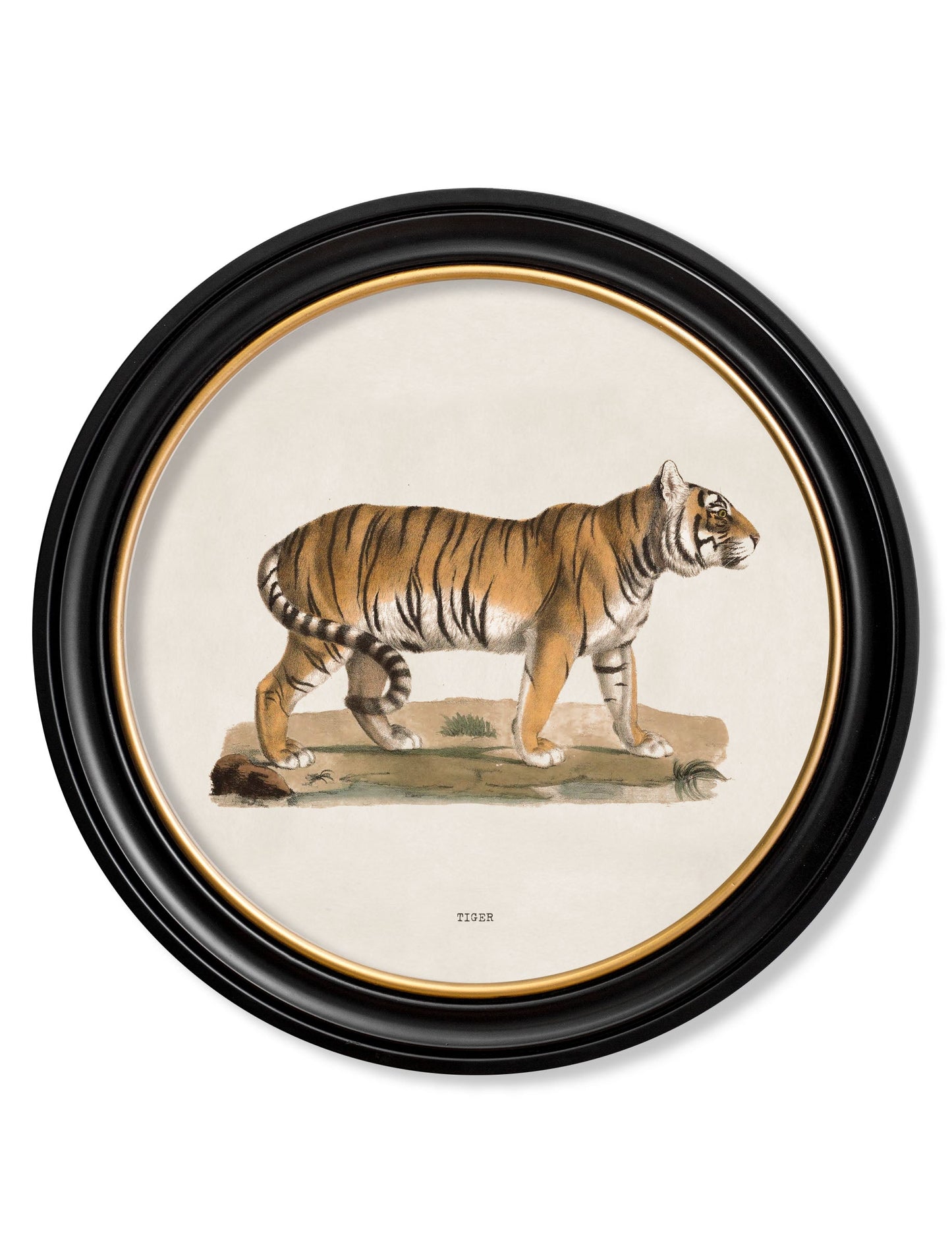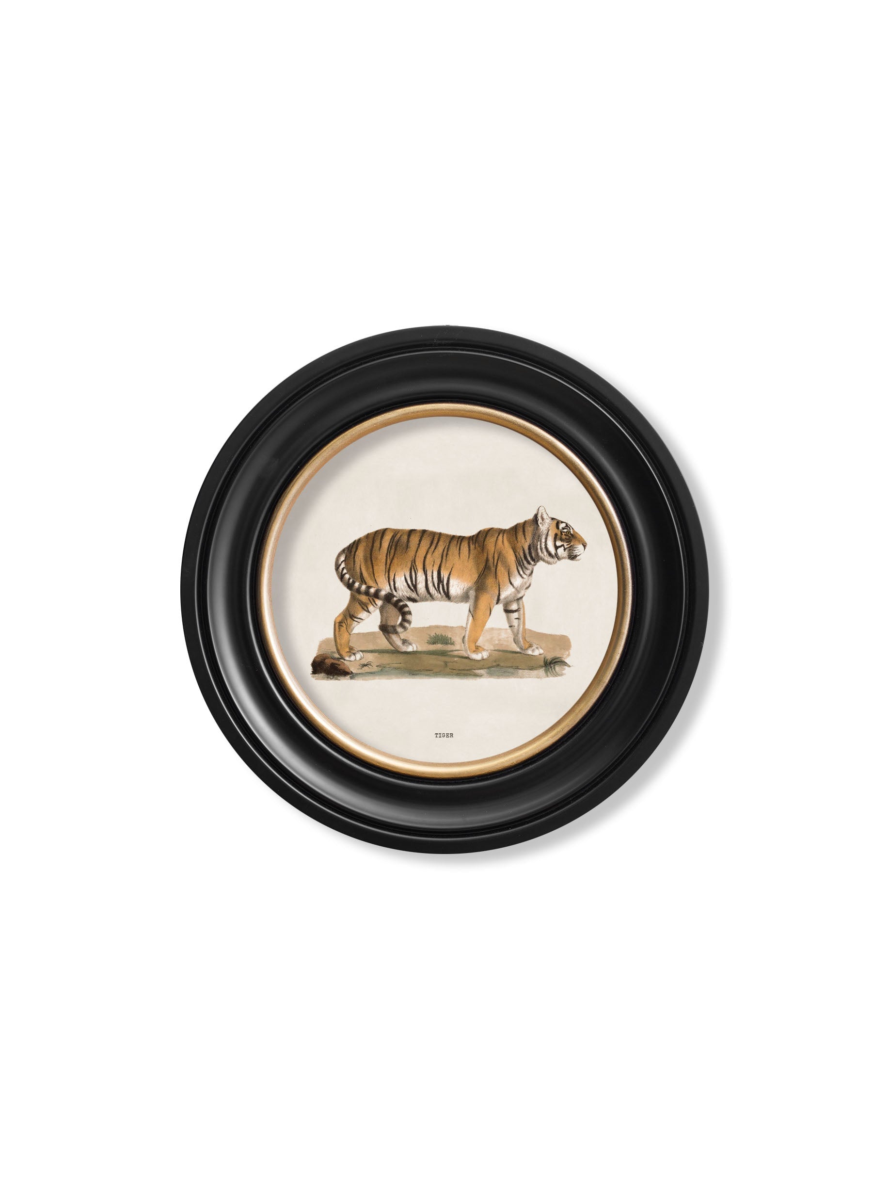 Referencing a vibrant French print from the first part of the 19th century, this striking tiger illustration has been digitally restored and enhanced here in our studio in Lancashire to bring its vivid colour back to life. For maximum visual impact, it’s presented in an eye-catching round frame custom-made in the UK from sustainable wood and finished in house.