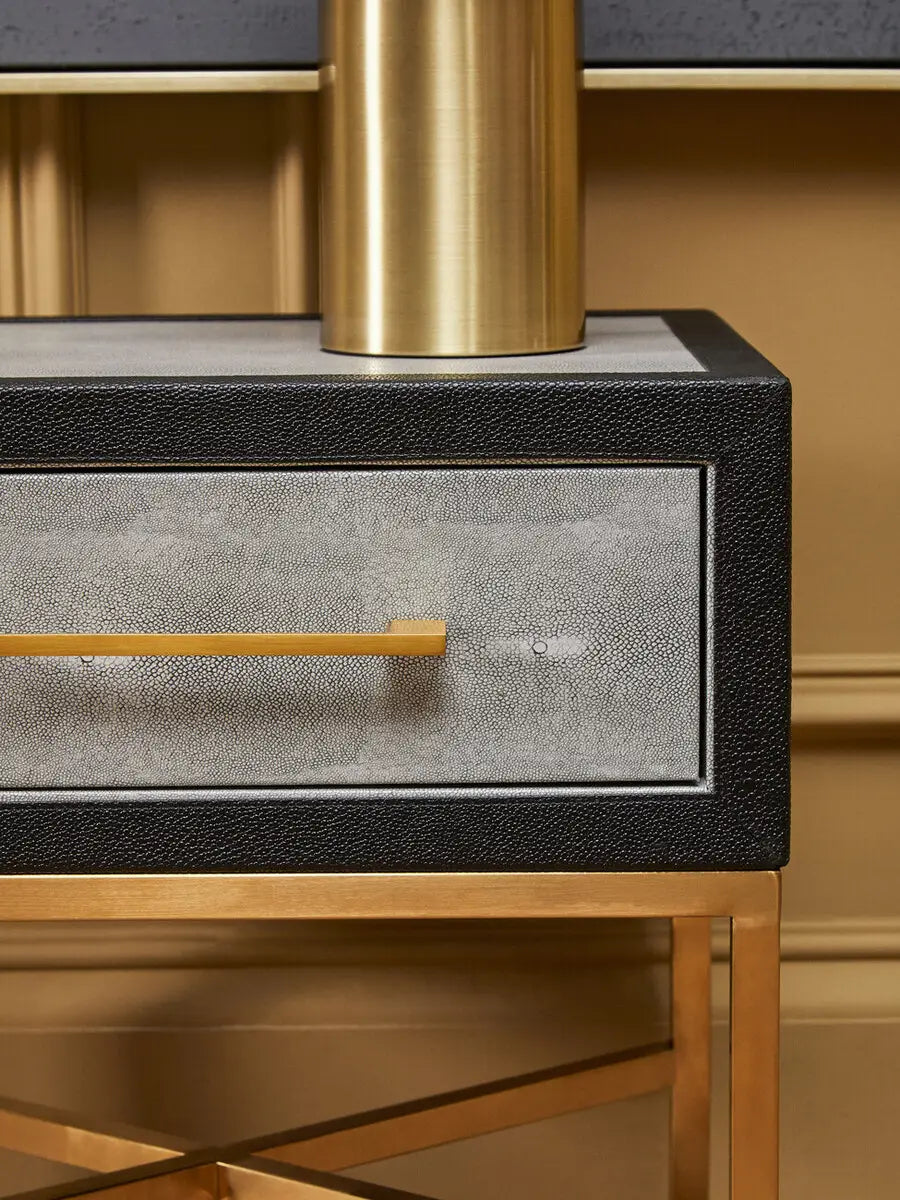 Indulge in luxury and refined taste with the gorgeous Cadiz 1 Drawer Side Table. Its stunning grey faux shagreen body is complemented by a sleek black border. The elegant brushed matte gold cross base and minimalist drawer handle create a stunning contrast against the gray top.