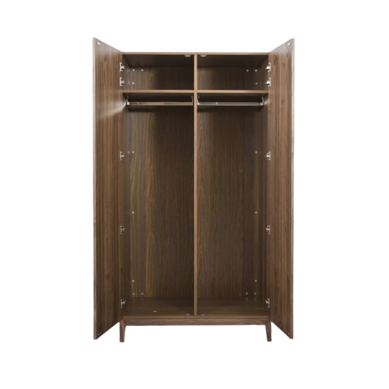 This walnut wardrobe has a rich and luxurious feel, with beautifully tapered legs it comes with the shelf and hanging rail and a centre panel for additional strength.