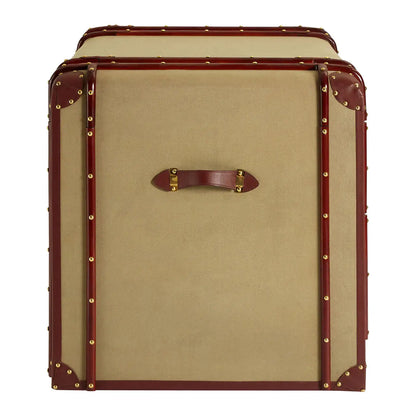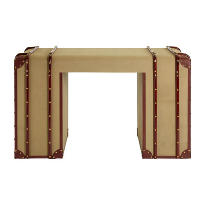 Crafted from eco-friendly mango wood and adorned with textured canvas, this exquisite desk features two drawers on each side, complete with luxurious leather handles adorned with brass colored studs. A spacious, slender drawer rests beneath the top surface, and wooden strapping embellishes the sides to match the stunning leather trim.