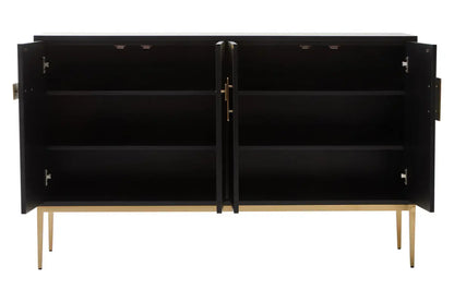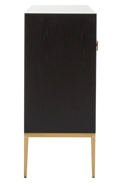 The striking Davoli sideboard showcases two contrasting tones and elegant diagonal designs. The subtle grain of the grey side is beautifully offset by the fluted black side, exuding sophistication. The piece is perfected with luxurious gold finish metal handles and a sleek base.