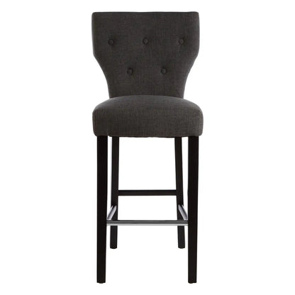 This chair features a grey fabric upholstery, with a cushioned seat and a sleek, beveled backrest. Its sturdy black rubberwood legs exude elegance, and the metal footrests add an element of comfort.