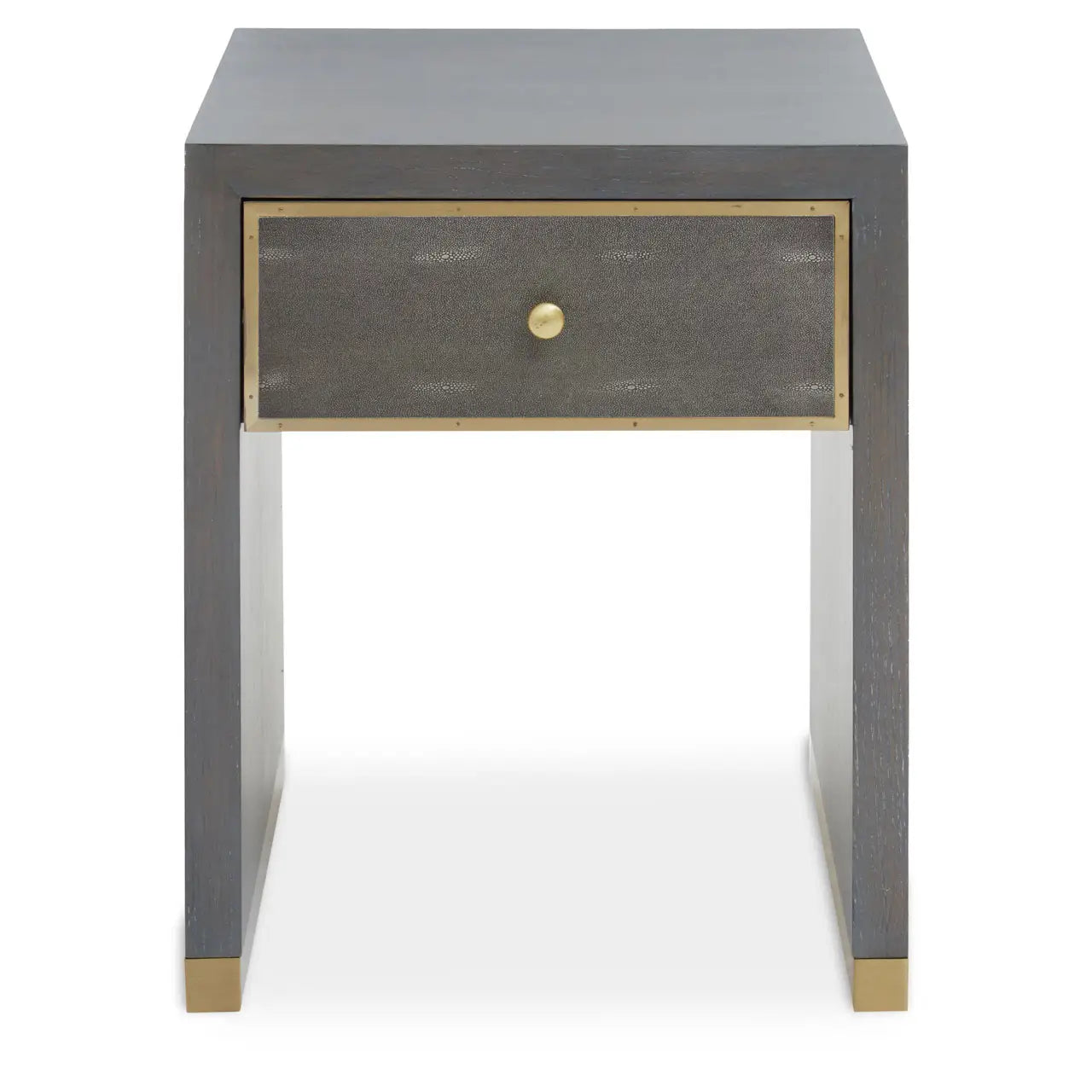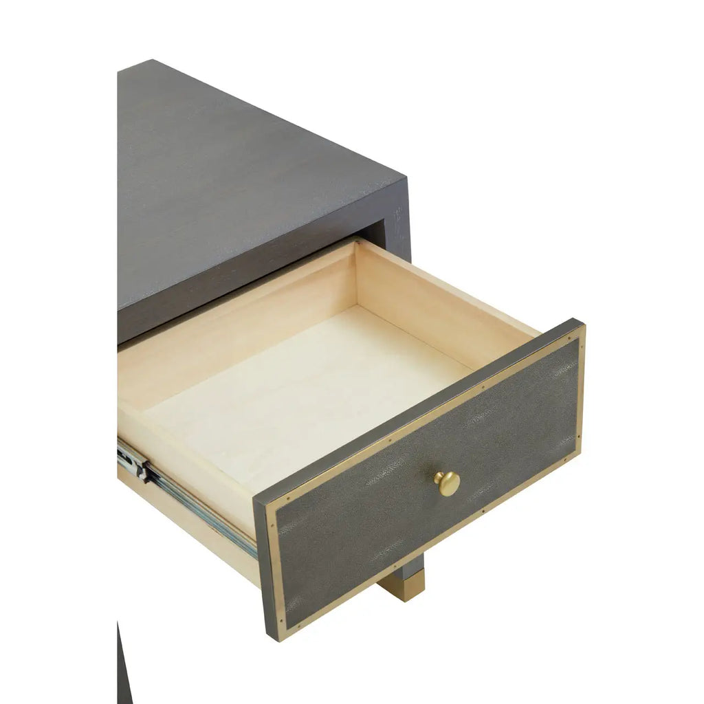 This exquisite grey table boasts a contemporary design and is crafted from MDF, finished in a sleek grey hue. The front drawer is adorned with luxurious shagreen effect composite leather, adding a touch of opulence. The table's grey structure is elevated with lavish gold metal accents, resulting in a visually striking contrast.