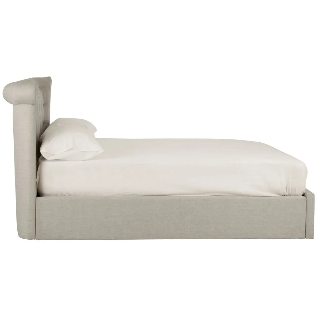 The Edison light grey linen double ottoman bed has button tufted panel adding classic character to its decorative aesthetic. The soft upholstery is adorned with button detailing on the headboard and footboard.