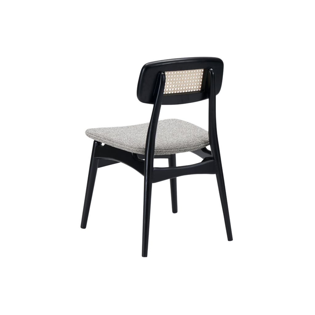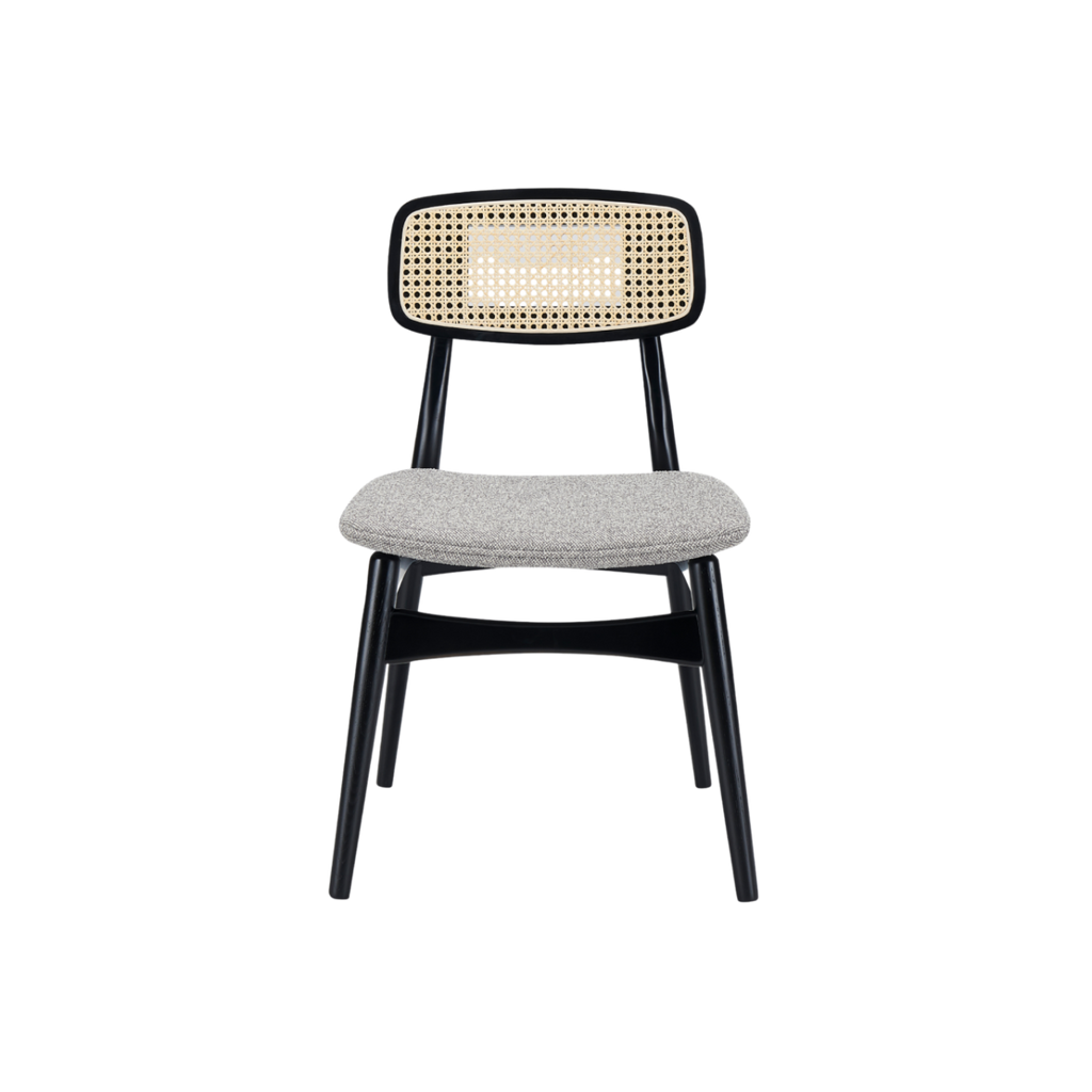 Experience effortless elegance with the Elder Dining Chair. This chair brings together a combination of bohemian and Scandinavian styles, to give you a unique and charming piece of furniture. This chair offers a natural and organic aesthetic and features a black frame with rattan open weave that adds a touch of warmth. The seat is designed for comfort with a flat woven boucle upholstered cushion and the chair's cylindrical, angular design is sure to make a statement in any dining room.