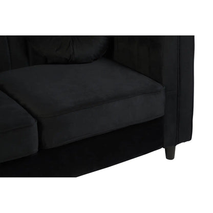 The Farah sofa boasts a refined, squared shape. Its elegant design is enhanced by vertical channel tufting, creating a graceful pleat effect on the back and armrests. The sofa rests on four eucalyptus wood feet finished in sleek black, further adding to its modern and luxurious appeal.