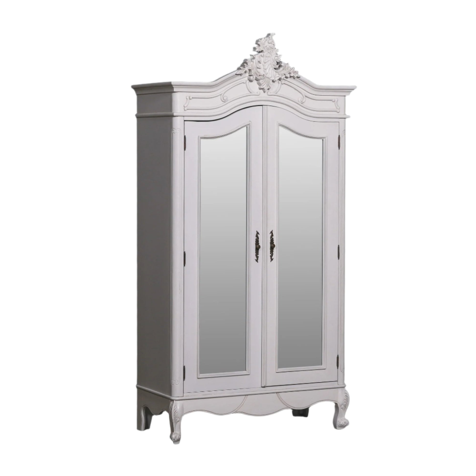 Indulge in the luxurious elegance of our French Style White Carved Double Full Mirrored Armoire. With intricate carved details and full mirrored doors, this armoire is not only a functional storage piece but also a stunning statement piece for any bedroom. Embrace the lavishness of French design with this exclusive, handcrafted piece.