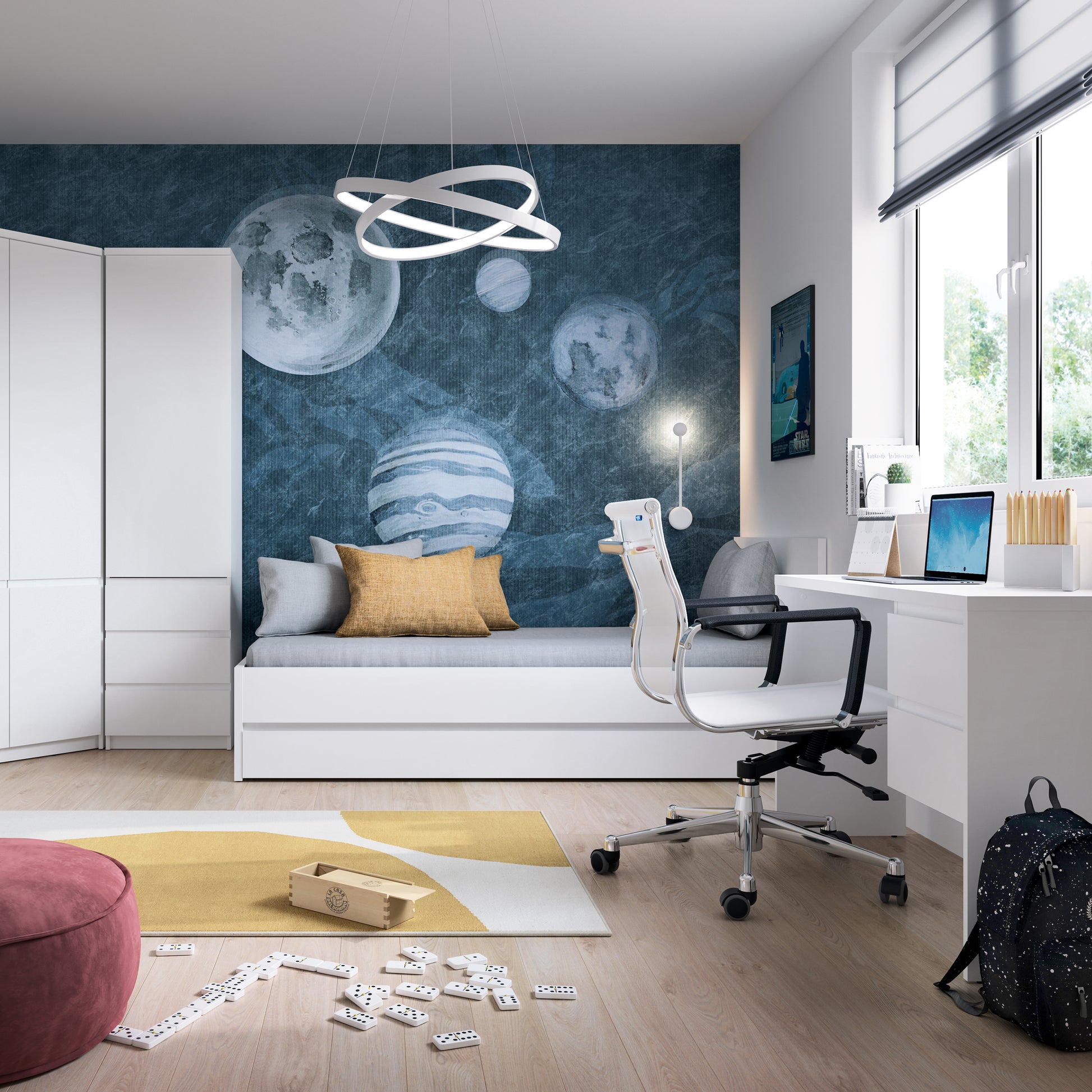 A modern, white desk is the perfect solution to create an office corner in the living room, its simple, minimalist form will not overwhelm the interior and help to control harmony in your home. The interior of the desk is very practical, a full extension drawer, a cupboard and shelves in the open space will provide plenty of storage space. The desk is made of laminated chipboard, resistant to damage, scratches, moisture and high temperature, which ensures durability for many years. The program is available in two color versions: Alpine White and Golden Ribbeck Oak.
