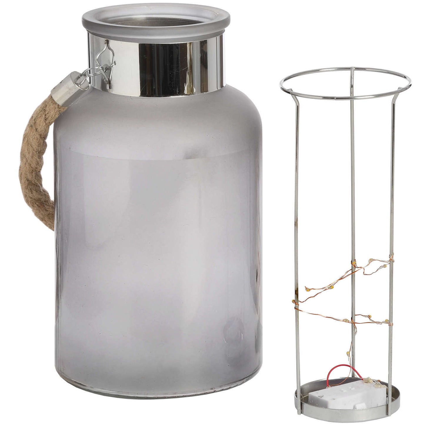 Frosted grey glass lanterns with rope detail handle and internal LEDs. These lanterns are elegant unlit and bewitching when switched on. A string of tiny LEDs coil around any easy to remove metal insert and appear as stars on the jar's exterior thanks to light diffusion from the frosted grey glass. The perfect additions to a create a cosy, atmospheric set-up inside or outdoors. Batteries not included. 2 x AAA needed.