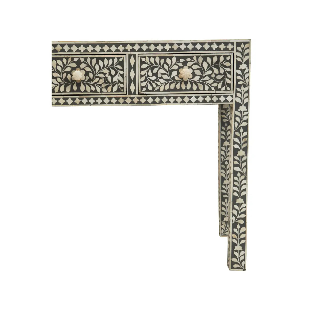 Indulge in the sophistication of our Fusion Three Drawer Study Desk, boasting handcrafted white buffalo bone accents delicately placed on ethically sourced grey wood. With three spacious drawers, each adorned with a beautifully carved, floral handle, this classic desk offers ample storage. The intricate bone cutouts create an elegant floral motif, adding a timeless touch to the overall design.