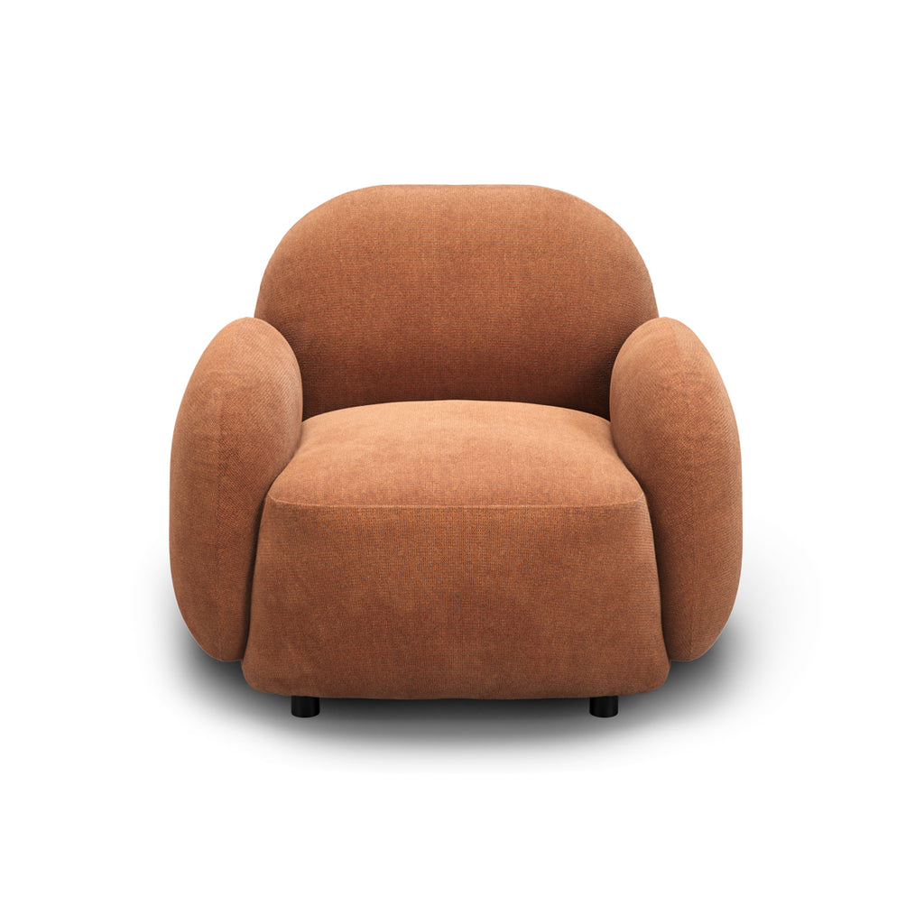 The Hagu Bone Chair features a curved design with weave fabric upholstery and plump cushions, offering both comfort and style.