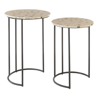 The mother of pearl tiles that cover the top and sides are largely natural in colour, with black versions interspersed throughout that give it a pixelated look. Their legs are made from black iron and have crescent bases that complement the round lines.