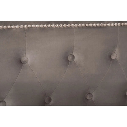 Elevate your bedroom with the Hannah Ottoman King Bed in elegant grey velvet. Its tall, tufted headboard, accented with stud detailing and button tufting, exudes a refined aesthetic. The sturdy, natural wood frame offers both durability and ample storage space.