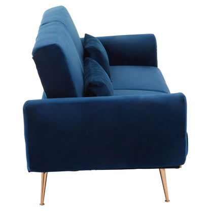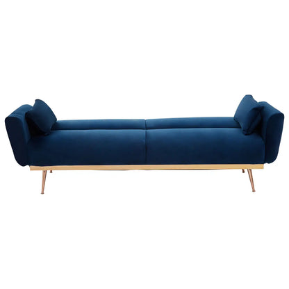 This sofa bed is upholstered skilfully with dark blue velvet that blends easily with luxe interiors. The backrest of this sofa comes with a lowering mechanism to create a bed while the foam padded wooden frame sits atop rose gold finish metal legs.