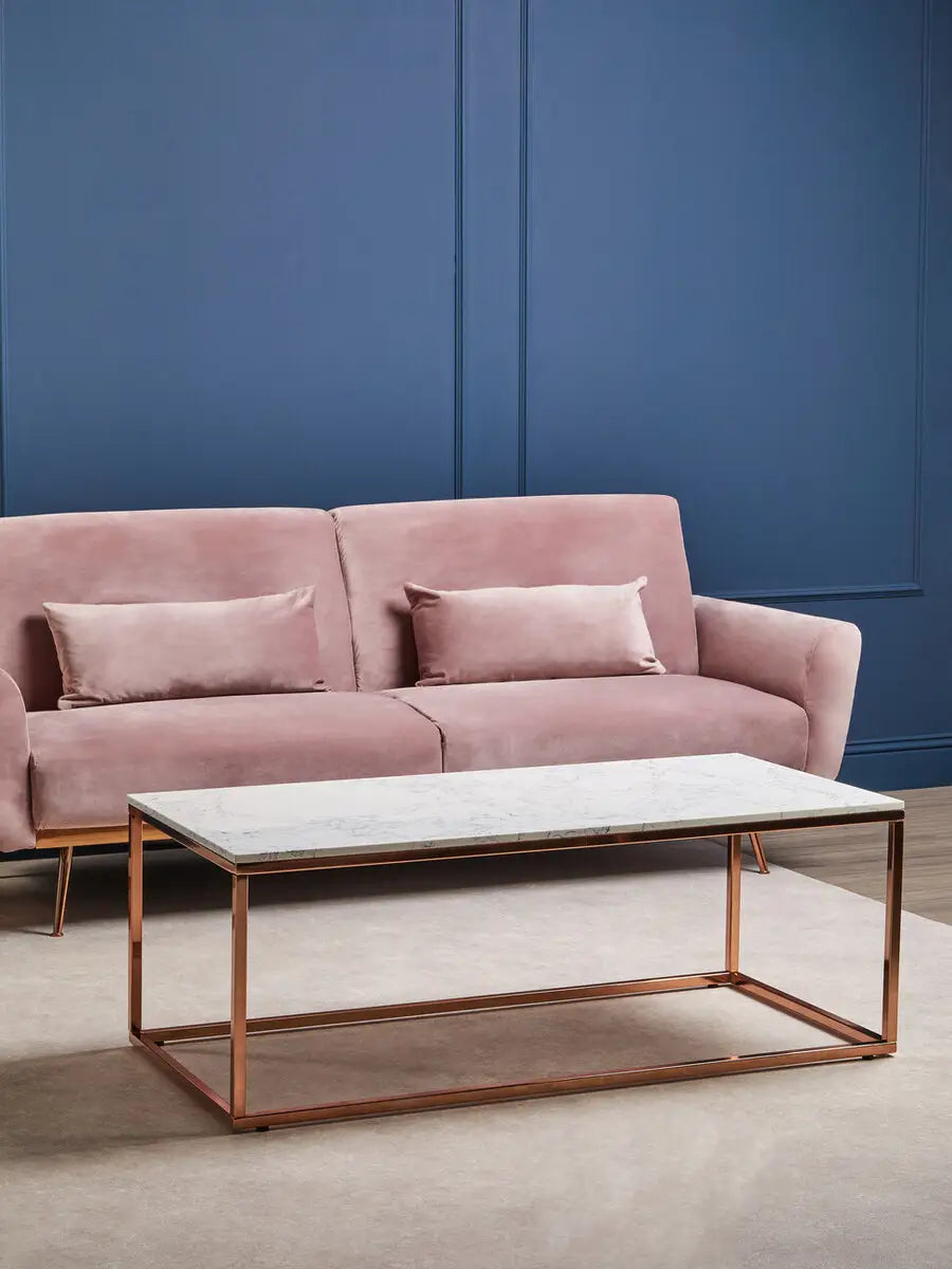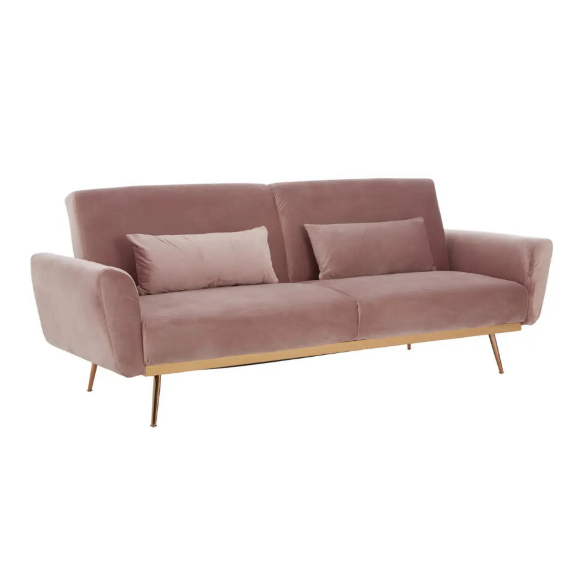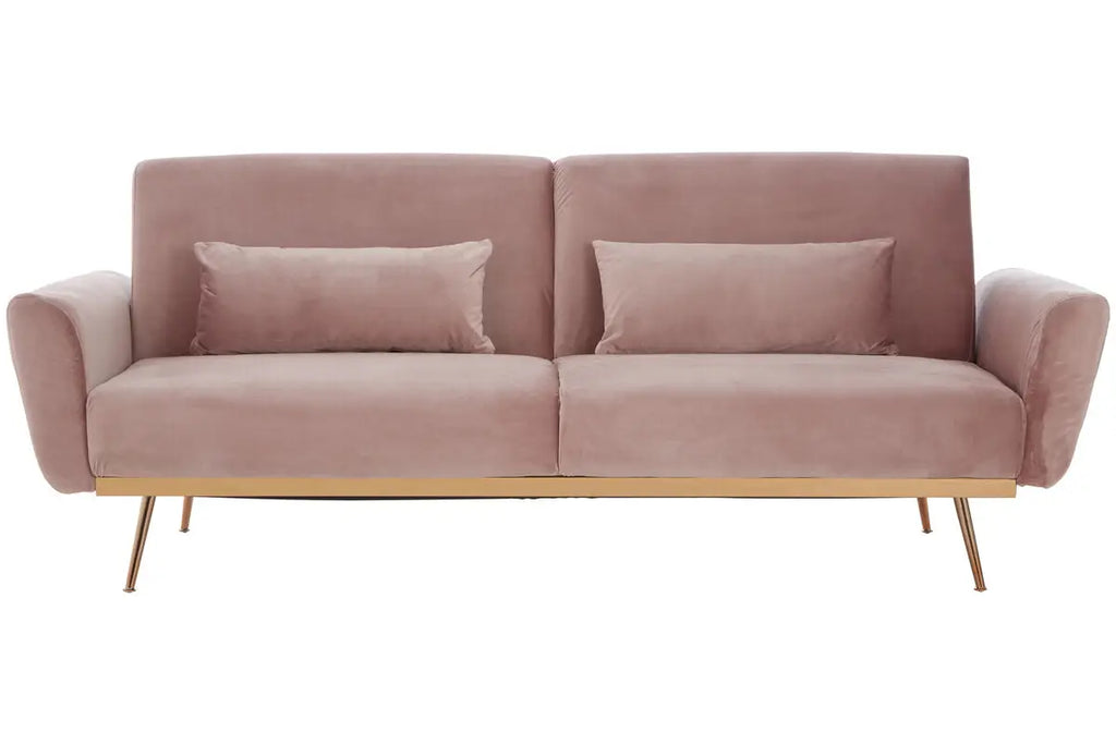 This stylish sofa bed in luxe pink velvet rests on minimal warm metallic legs. The angular back comes with a lowering mechanism to create a bed while the seat in sumptuous padding matches the cushions and flared armrests.