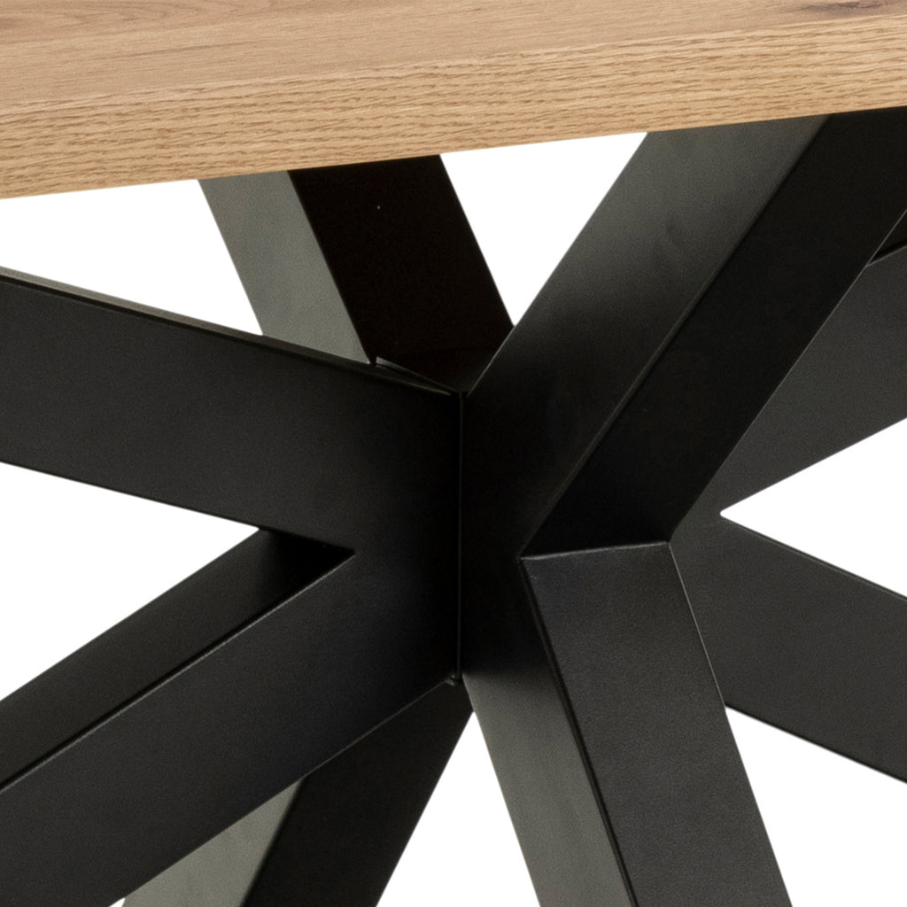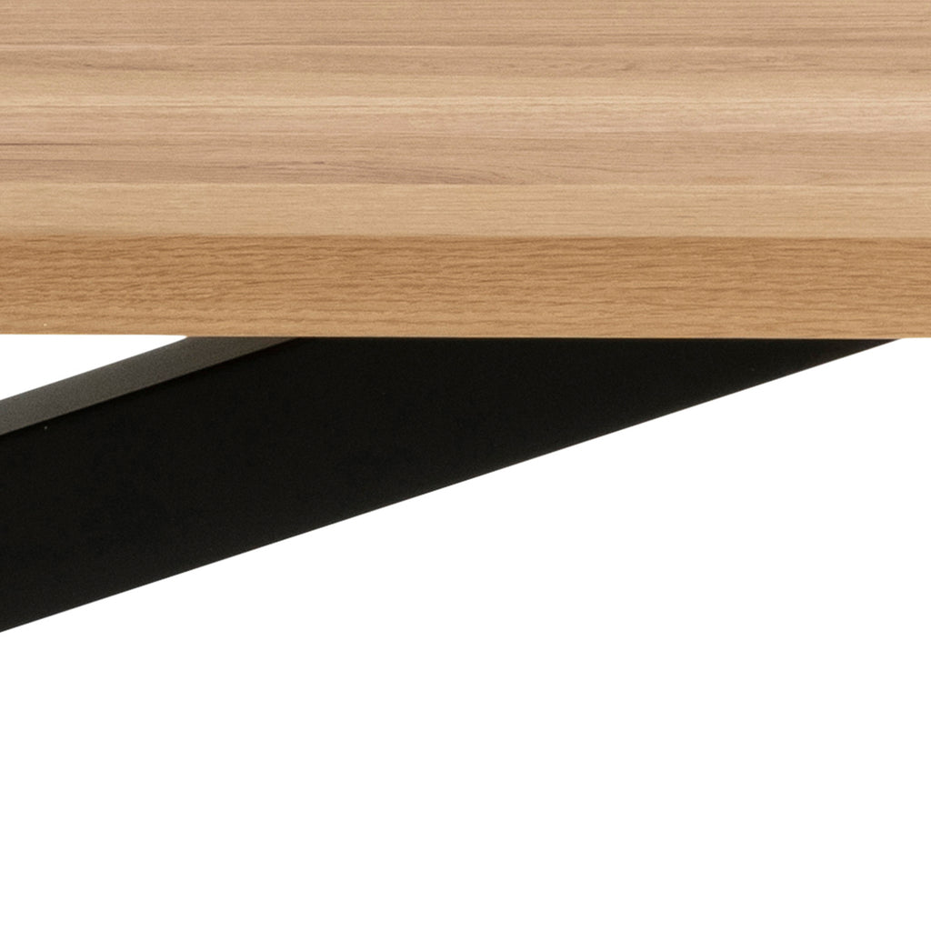 Introducing the centerpiece of your dining room - a dining table that marries rustic charm with modern elegance. Its spacious rectangular tabletop comfortably accommodates up to 10 people, ideal for intimate gatherings. Infusing a touch of nature indoors, the tabletop boasts an oiled wild oak veneer surface, lending an inviting warmth to the space. Supported by a sleek black metal cross base, it exudes vibrant energy, filling the room with vitality.