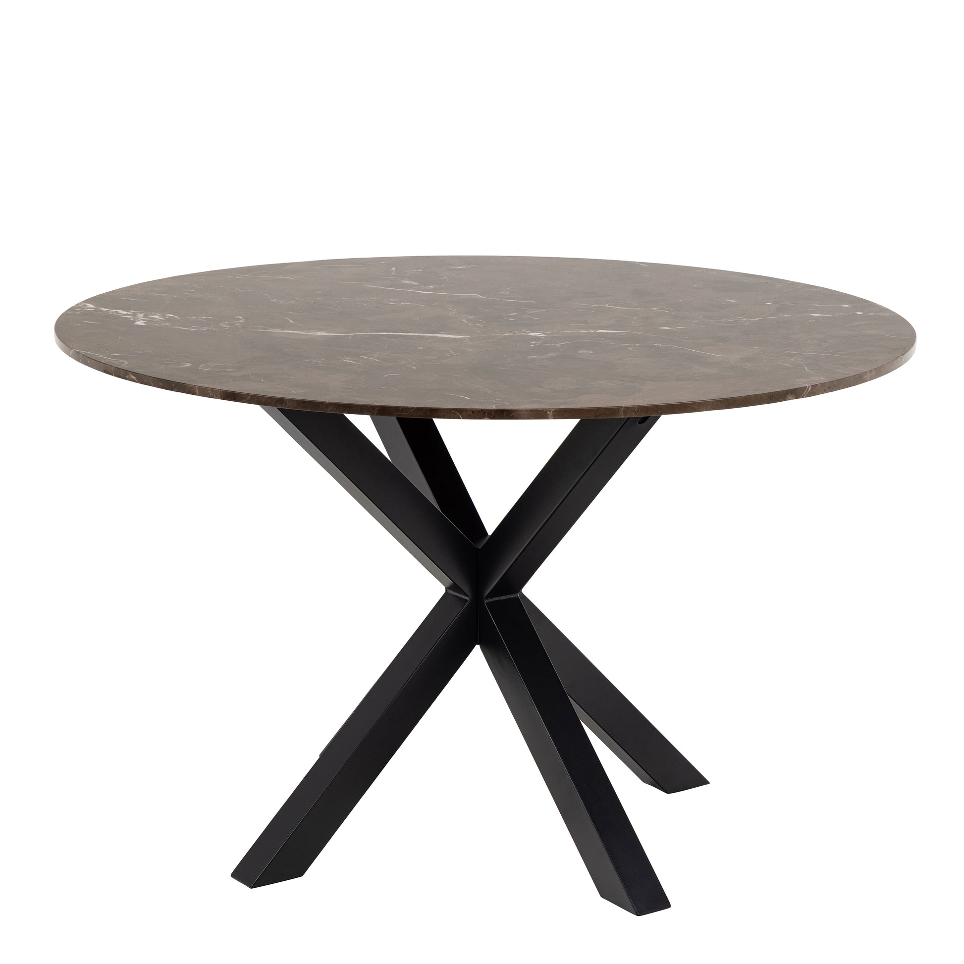 Delight in the warm, inviting ambiance created by this round dining table. Its top, finished in wild oak oiled veneer, complements the bold matte black cross base, offering a striking piece that marries rustic charm with modern design.