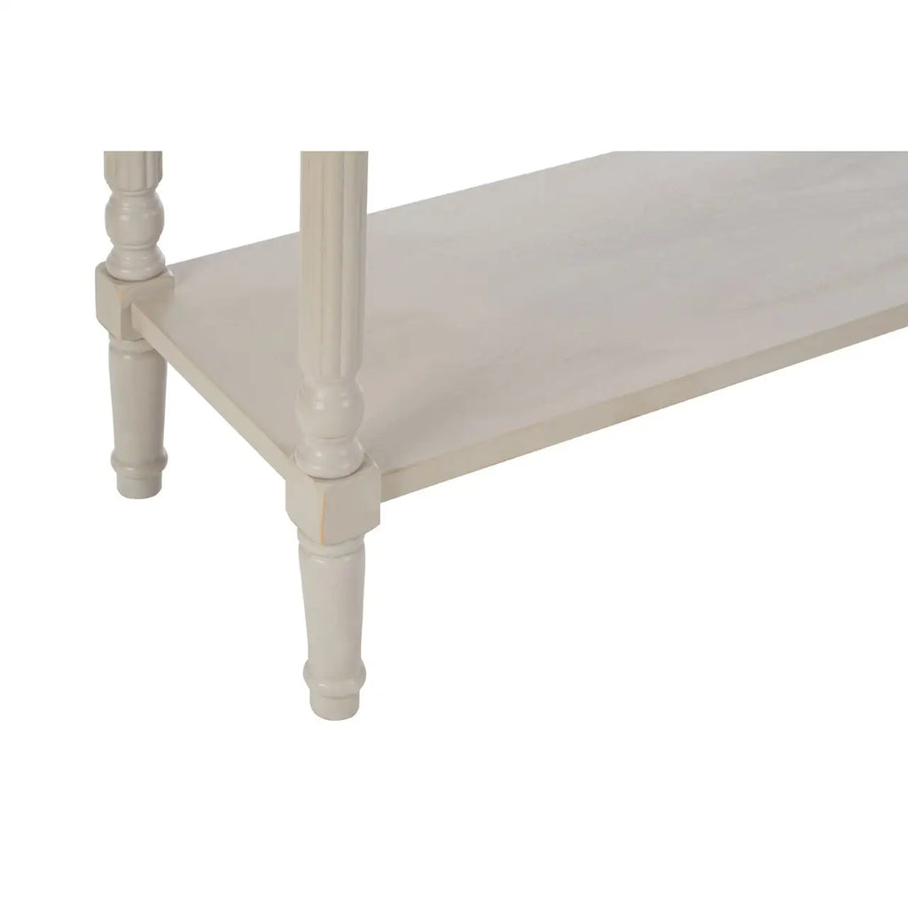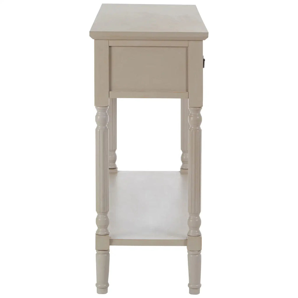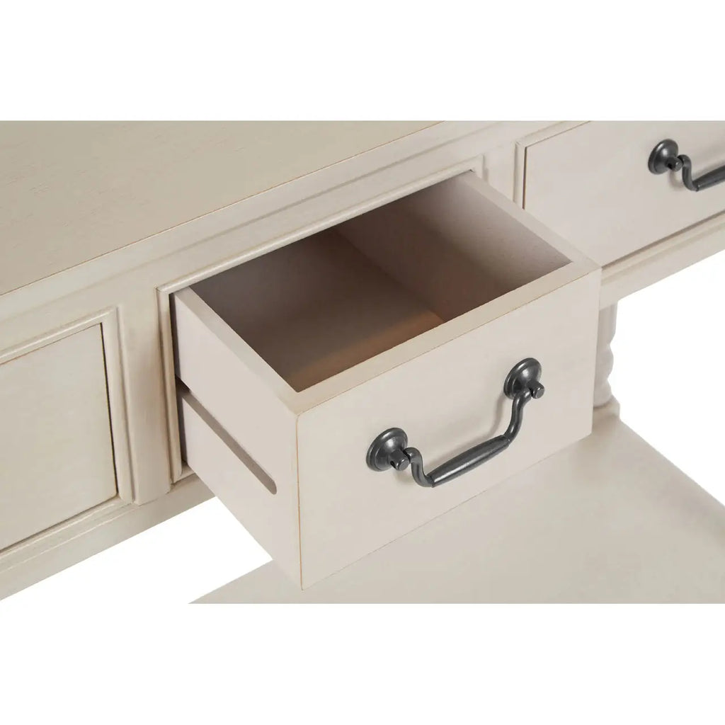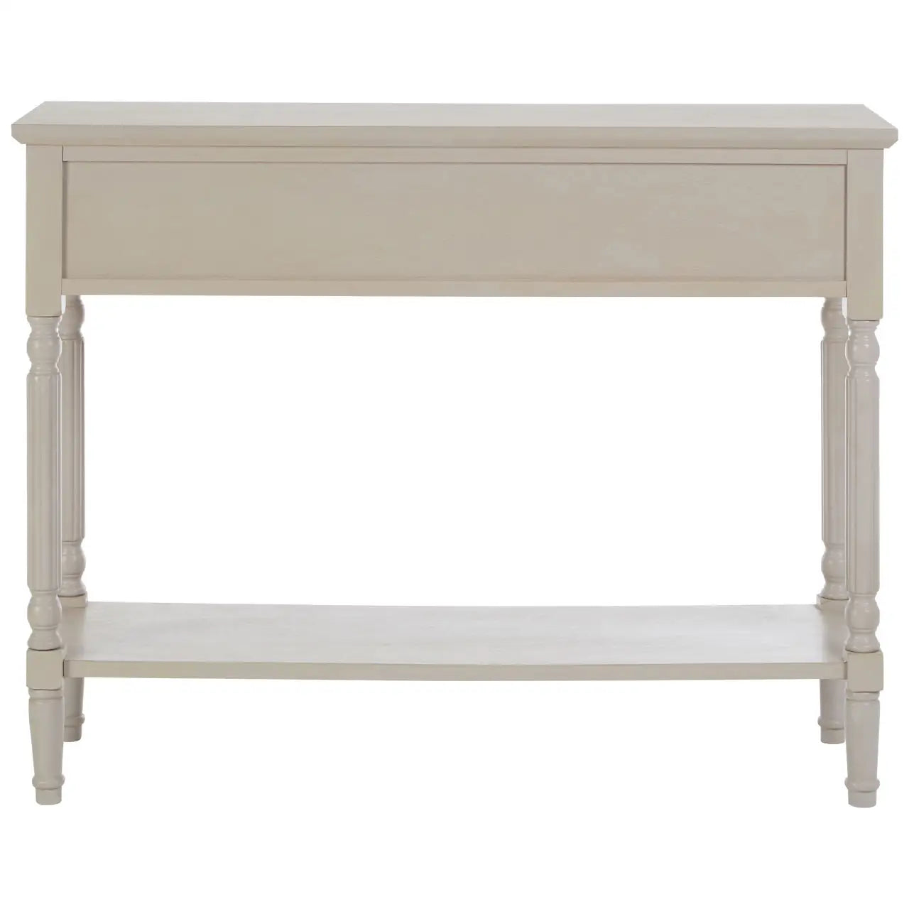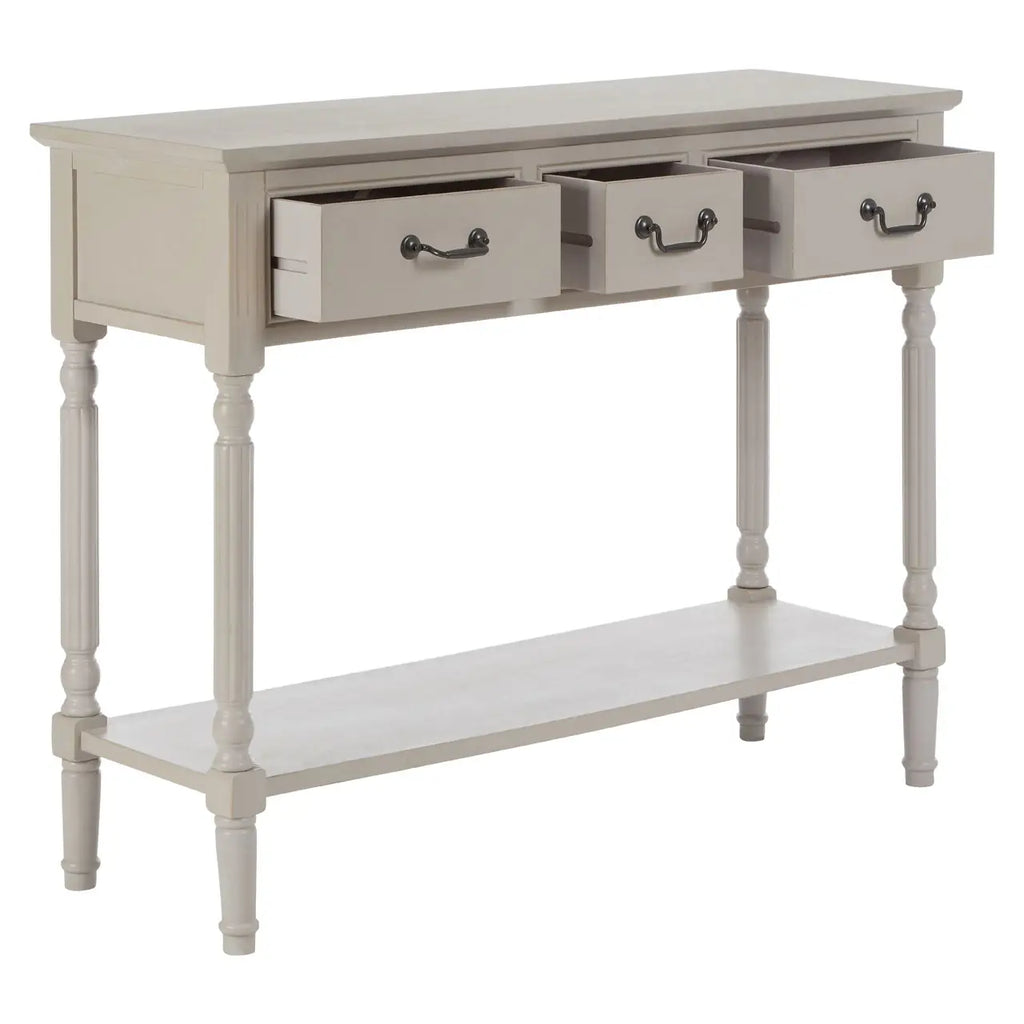 Crafted from authentic wood, the vintage grey finish on this wooden console table enhances its classic aesthetic. Adorned with sophisticated metal handles, the piece boasts three drawers for storage and a lower shelf for tasteful decor display.
