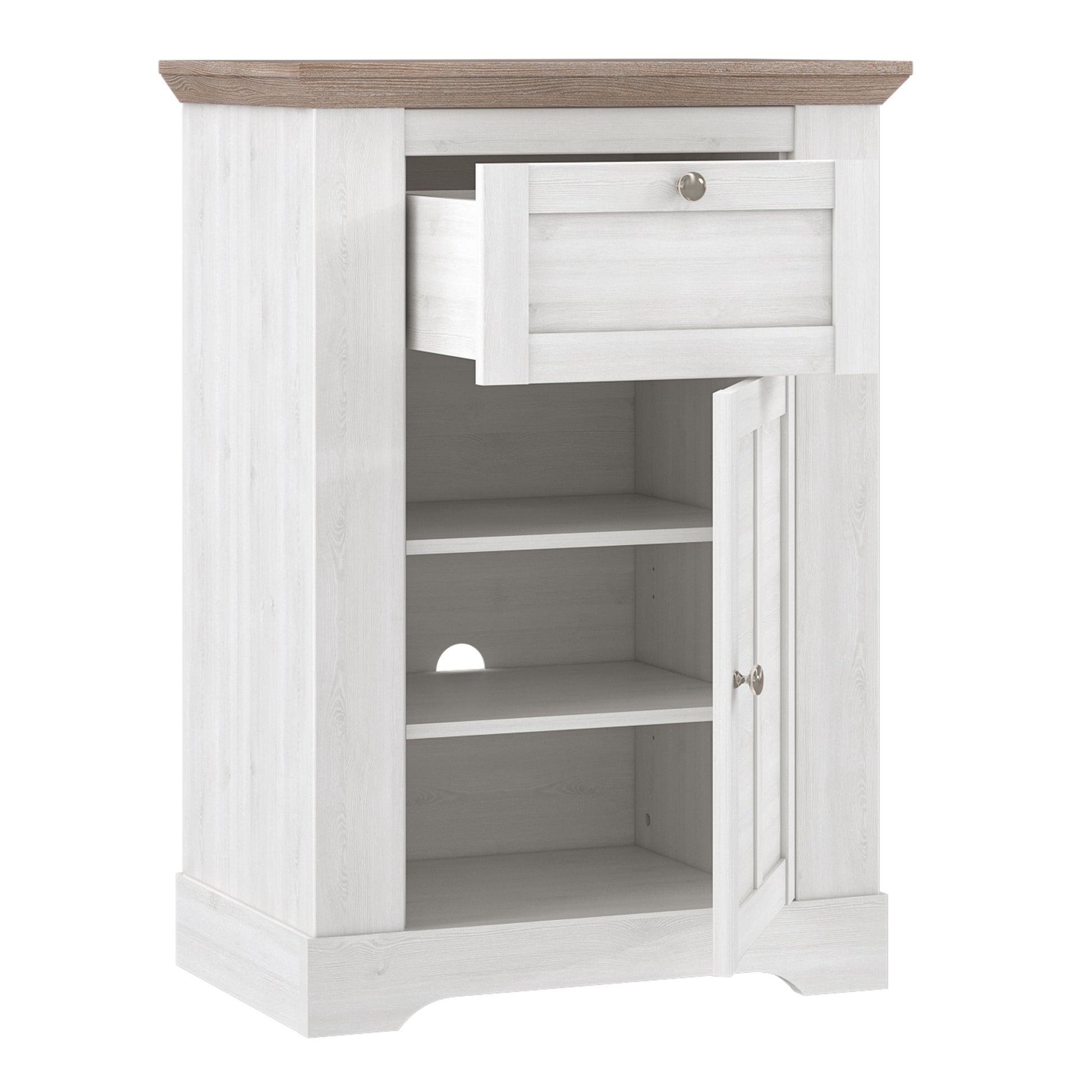 Enhance the ambiance of your home with the exquisite Illopa collection, a seamless fit for any living space. Its most outstanding feature lies in the array of shapes it offers, granting you the freedom to artistically arrange every room in your house, from the inviting hall to the cozy living room. The captivating combination of beautiful white and oak imbues your home with a sense of tranquility, fostering an atmosphere of relaxation and peace.