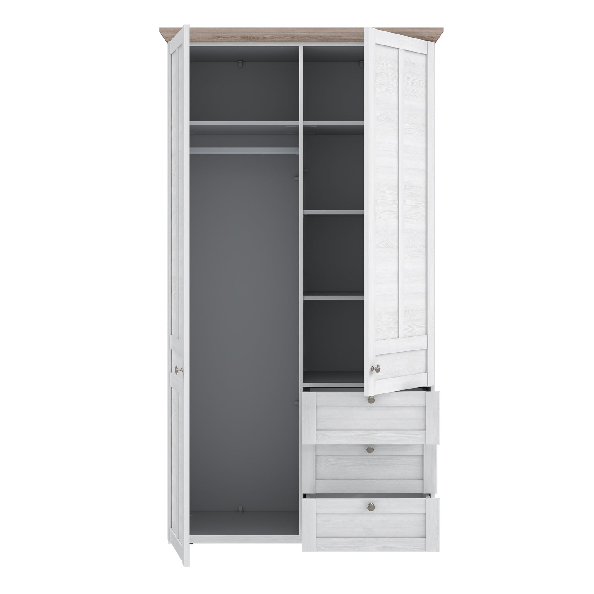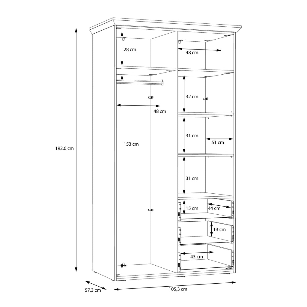 • Intelligent Storage Configuration: Featuring a combination of three drawers, a full-length hanging rail, and multiple internal shelves to maximise organisational potential.