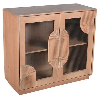 Introducing the elegant and versatile Indus small sideboard, a perfect blend of functionality and artistic design. Measuring 95x40x85 cm, this sideboard is crafted from high-quality mango wood and finished in a sophisticated pale taupe lacquer. The standout feature of this piece is the fluted glass doors, which add a touch of modern elegance while allowing a glimpse of the contents inside. The artistic pattern on the doors enhances aesthetic appeal, making it a statement piece in any room. With two spacious shelves measuring 92x35x80 cm each, this sideboard offers ample storage space for your essentials. No assembly is required, making it a hassle-free addition to your home.
