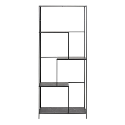 Organize your space with our contemporary bookcase, which features a sleek frame and base in matte black rough powder-coated steel. The four shelves in matte black melamine provide ample storage with a unique asymmetrical design, adding a modern touch to any room.
