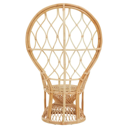 Crafted with care from sustainable natural rattan, this chair boasts a tall back that gracefully curves into a stunning peacock motif, accented by gently sloping arms. Its cozy, flat seat nestles atop a unique inverted bowl base, adding the perfect finishing touch to its exquisite design.
