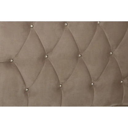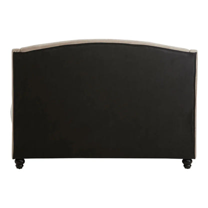 This bed features a grand, curved headboard with a diamond patterned tufting design that adds a stunning visual element and offers comfortable back support. The metallic button accents beautifully enhance the luxurious cushioning and enhance the bed's sophisticated look. The sturdy pine wood frame adds durability, while the orb feet in a black finish keep it stable above the ground.